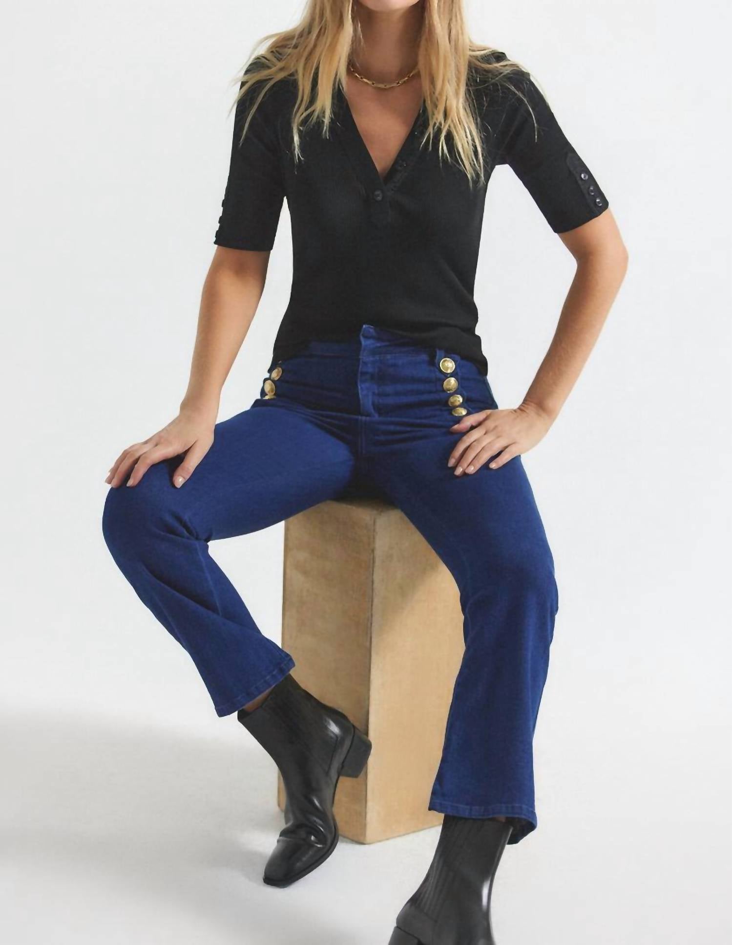 Tuck your favorite tee into these high-waist jeans for a more casual-cool feel. Introducing the Robertson Crop Flare Jeans by Derek Lam 10 Crosby, crafted in Lexington Dare for a sleek streetwear look. Featuring a high-rise design with a 10.75" front rise and flared legs, these jeans offer a comfortable fit with premium Italian denim and gold sailor button details. Composition: 81% Cotton, 11% Lyocell, 6% Elastomultiester, 2% Elastane. Closure: Zip closure. Made in the USA, with a 27.5" inseam and 17.5" leg opening. Care: Turn inside out and machine wash cold on gentle cycle, tumble dry low.