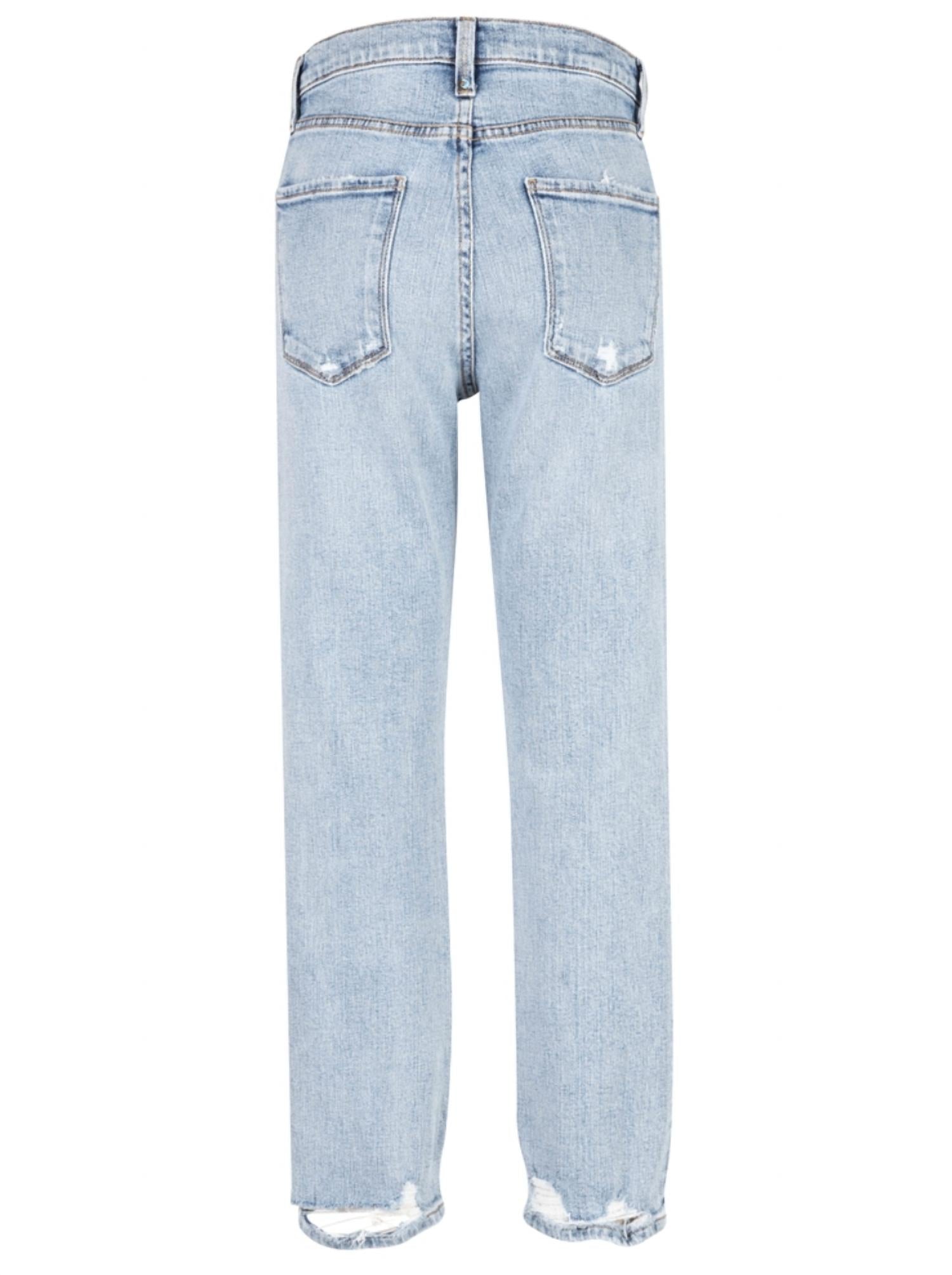 This classic straight leg jean has a perfect fit and goes with just about everything. The Olivier High Rise Long Straight Jeans by Edyson offer a flattering high-rise silhouette with a long, straight leg cut. These jeans, sporting an inseam of 28 inches, feature a hidden button fly for a sleek look, and the luxurious comfort stretch fabric ensures a loose fit through the hips, thighs, and knees. Crafted in a chic Light Fiori color, they showcase artfully distressed hems for an added touch of sophistication. Designed with convenience in mind, their classic straight leg style and solid pattern make them a versatile choice for spring occasions.