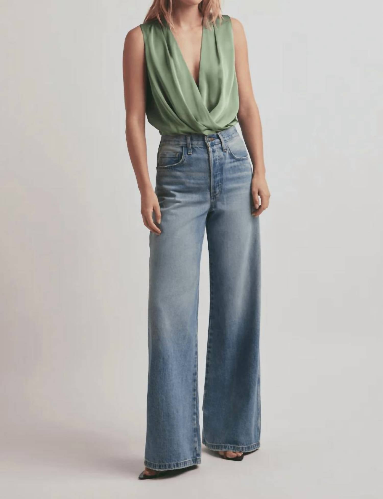 The Masha Super High Rise Wide Leg Jeans by Favorite Daughter in Haven offer a perfect blend of style and comfort with their full-length wide-leg design. Crafted from rigid denim, they feature a super high rise with an 11.5" rise and an easy fit at the hips, complemented by a generous 23.5" leg opening and a 33" inseam. With a button closure and five-pocket style, these medium wash jeans are ideal for summer vacations or casual workwear, easily pairing with various tops. Care is simple with machine wash and tumble dry instructions.