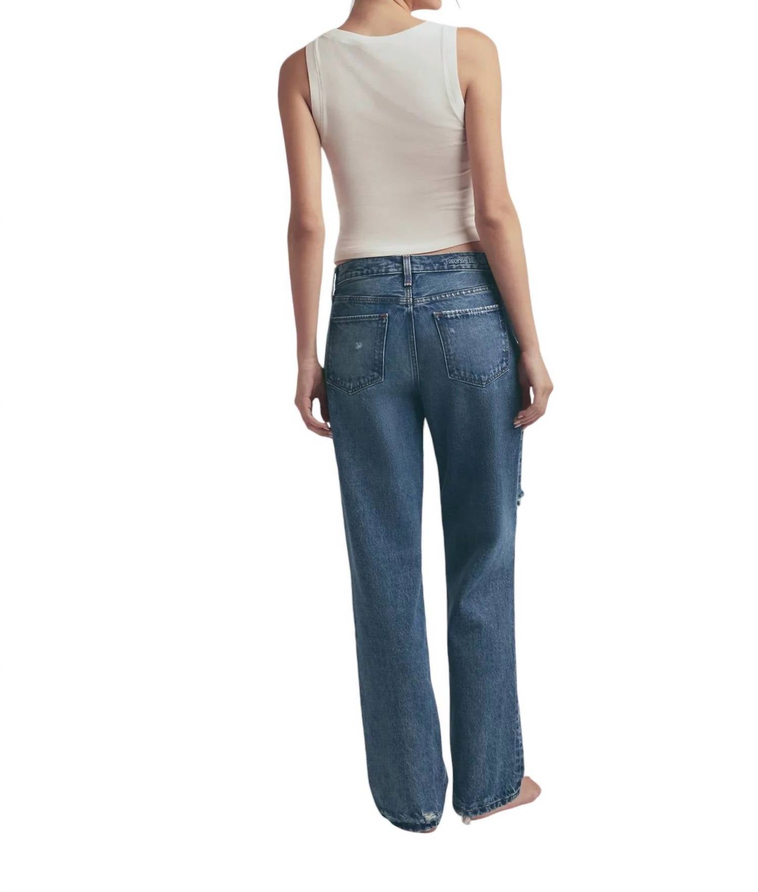 Esta calça jeans clássica de perna reta tem um caimento perfeito e combina com praticamente tudo. Esta calça jeans estilo boyfriend de cintura média é feita de jeans rígido com lavagem médio-escura e apresenta um corte artístico nos joelhos e coxas. Ela oferece um caimento relaxado com fecho de botão.