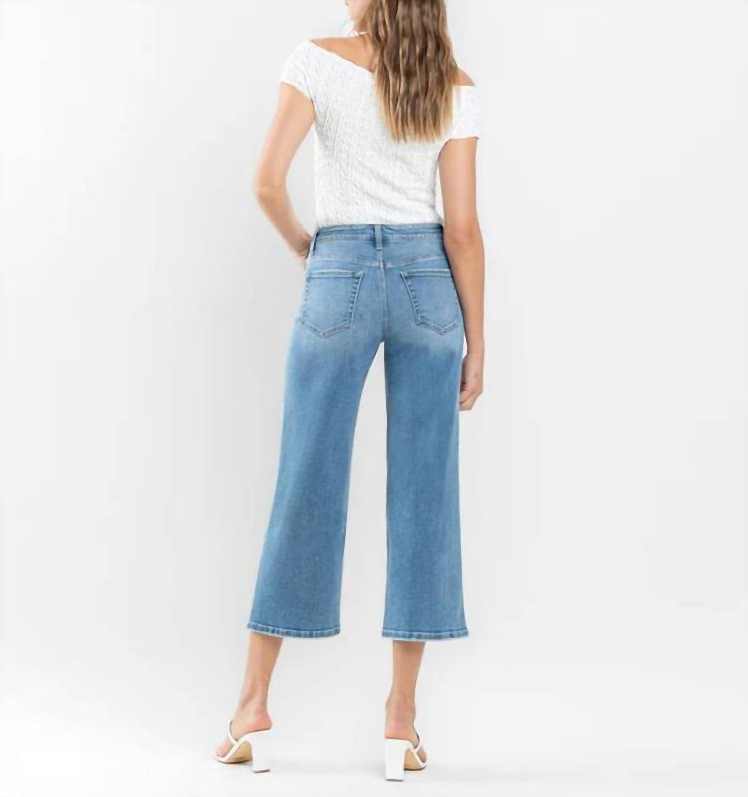 A flattering silhouette that's suprisingly versatile. Introducing the Beckoned High Rise Crop Wide Leg Jeans by FLYING MONKEY, ideal for streetwear lovers. These medium wash jeans offer a comfortable fit with their patterned cotton blend material. The wide leg style features a button closure, pockets, and offers a 10" rise with a 26" inseam. For care, hand wash cold inside out and lay flat to dry, avoiding bleach, ironing, twisting, tumbling, or dry cleaning.