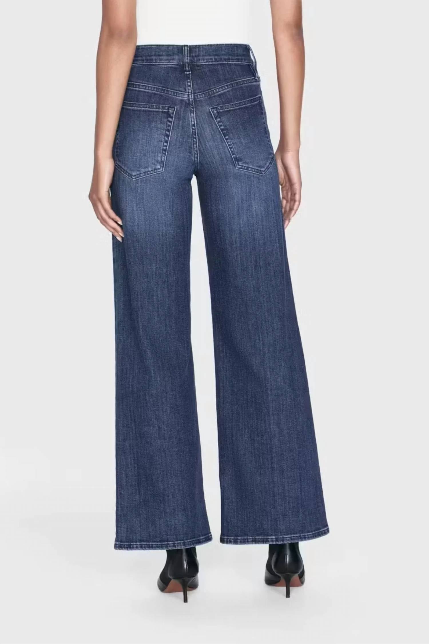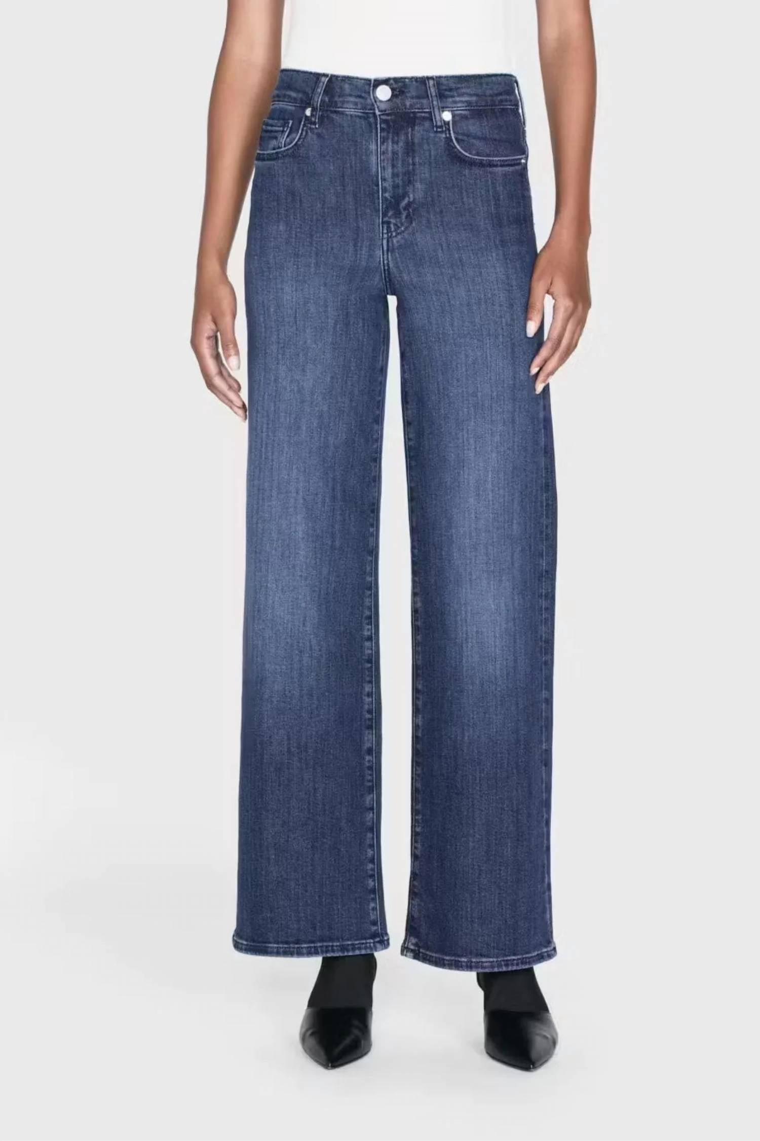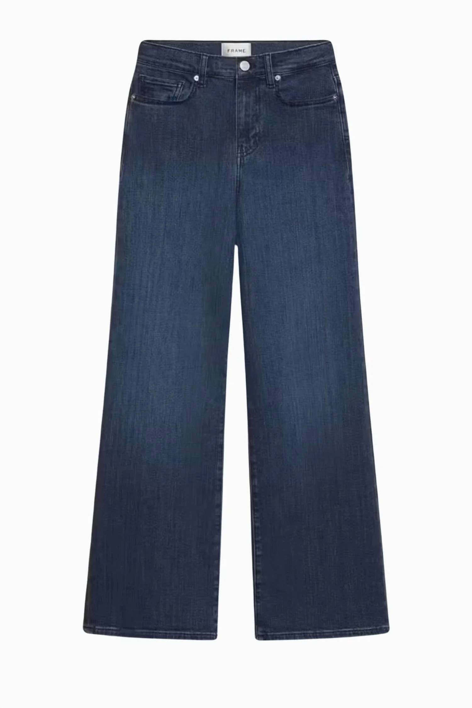 High-waist is here to stay and we especially love this style. Discover the Le Slim Palazzo Jean by FRAME, a sophisticated choice in a Thunderstorm hue ideal for fall concerts and vintage vibes. These elegant jeans feature a high-rise waist and wide-leg style combined with a flattering slim fit. Crafted from a sustainable ultra-stretch cotton blend, they comprise 77% Cotton, 18.5% Modal, 3.5% Elasterell-P, and 1% Elastane. Closure: Zip fly. Care: Machine wash cold. Measurements include a front rise of 10.75" and an inseam of 31".