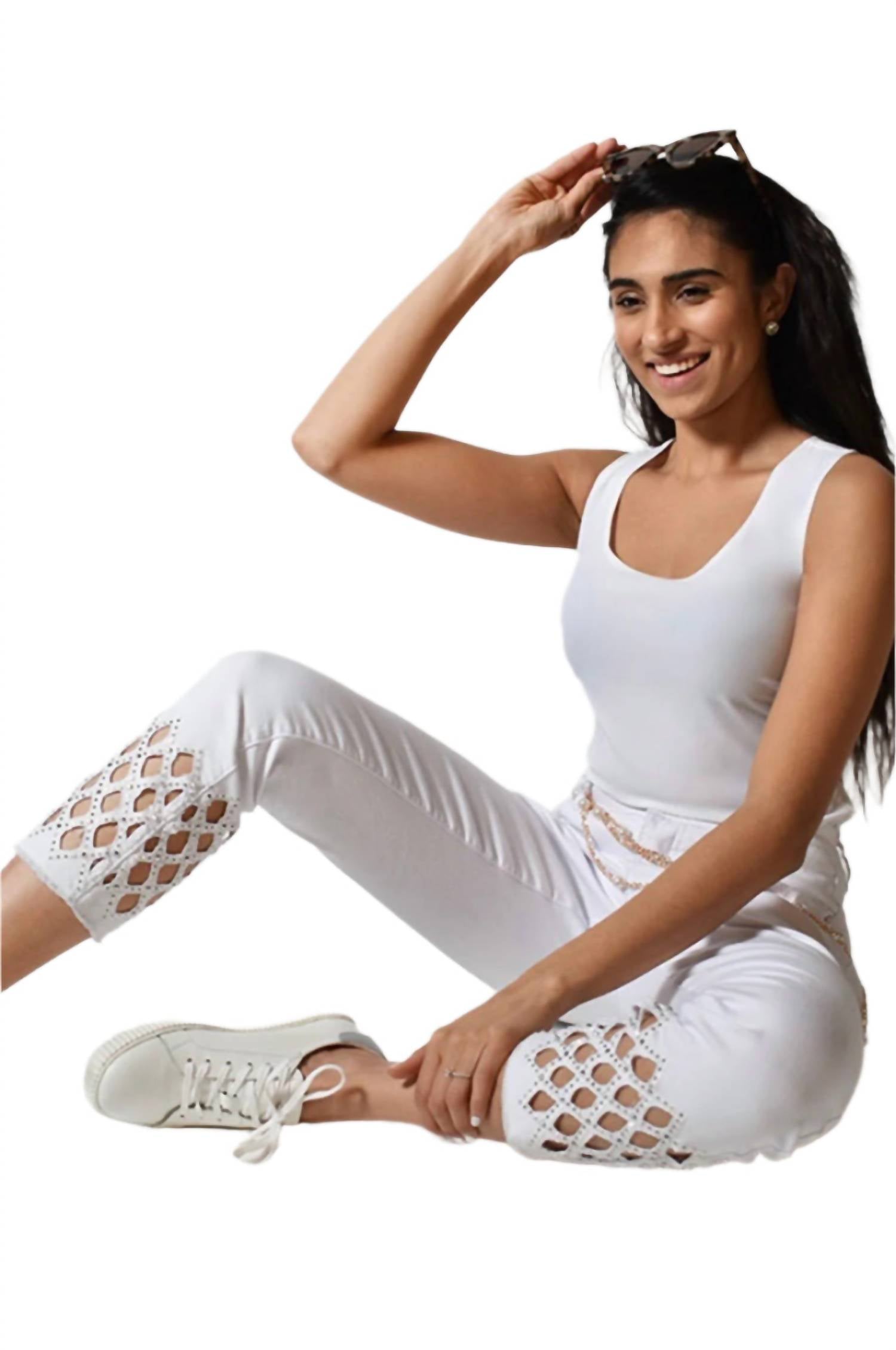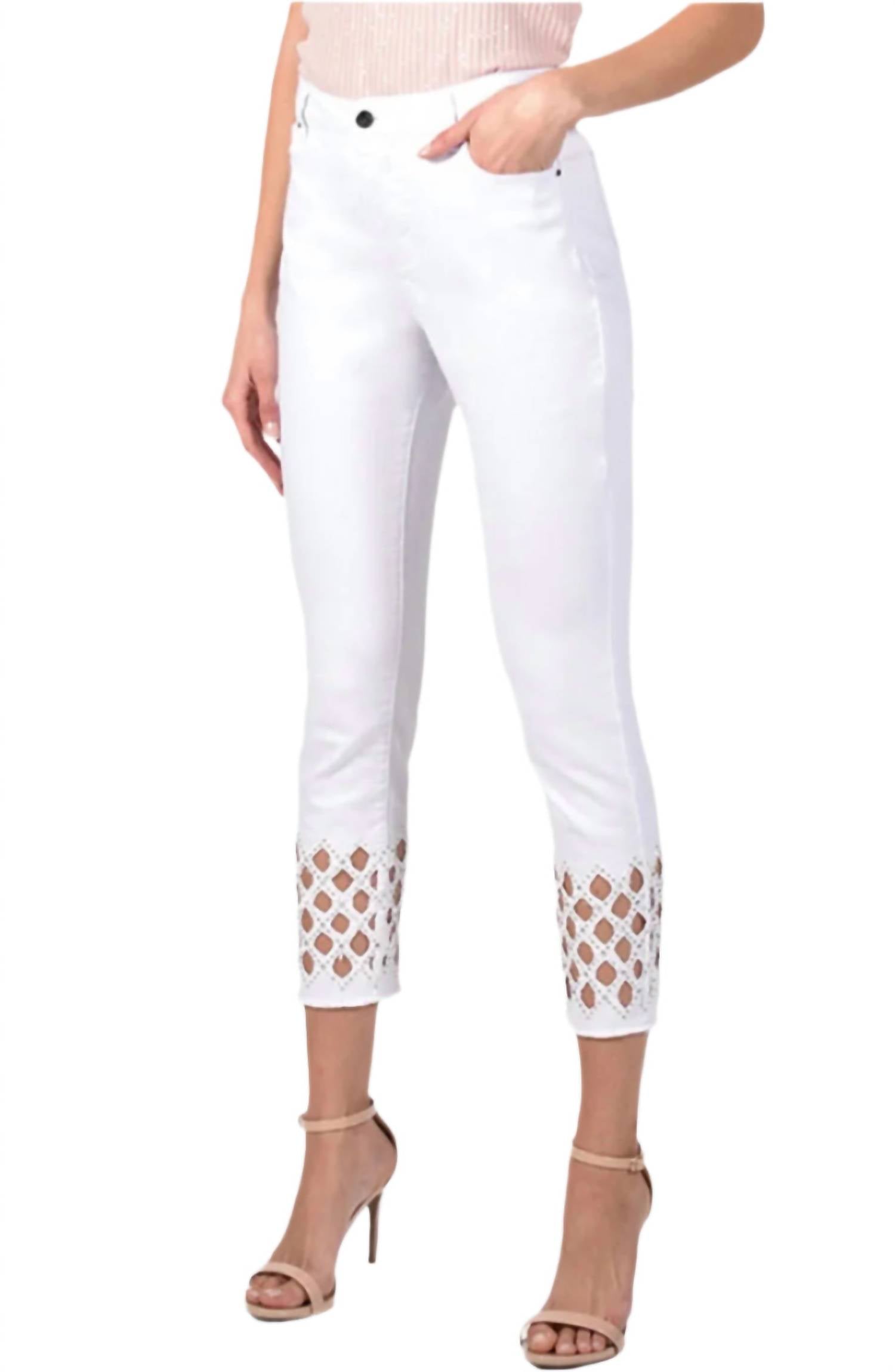 Uma calça jeans skinny que é estilosa e confortável. Adoramos esse modelo porque combina com botas, ou sem! Eleve seu guarda-roupa com a Calça Jeans Frank Lyman Cutout Dimante de Cintura Alta, uma combinação perfeita de estilo e conforto em um branco atemporal. Esta calça jeans de cintura alta e modelagem slim apresenta um recorte moderno com lantejoulas e bainha desfiada, além de fecho de botão para um uso seguro. Confeccionada com uma mistura de 98% algodão e 2% elastano, ela oferece um caimento elástico e confortável. O cuidado é fácil: basta lavar à mão do avesso com água fria e pendurar para secar. Com costura interna de 66 cm e cós de 28 cm, ela é ideal para um look streetwear chique.