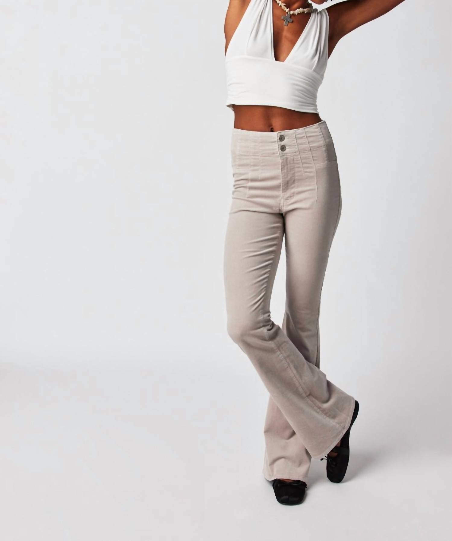 A flattering silhouette that's suprisingly versatile. Elevate your wardrobe with the Jayde Corduroy High Rise Flared Jean from Free People, a perfect blend of retro charm and modern flair. Crafted from a soft cotton blend with 98% cotton and 2% elastane, these jeans offer a comfortable and stretchy fit that feels as good as they look. The design features a super high-rise fit with a 12.5-inch rise and a flared silhouette, accentuated by exaggerated yoking and an exposed button fly. Color: Love Stone. Closure: Button closure. Care: Machine wash cold. Inseam: 33.5 inches. Ideal for adding a vintage touch to any spring vacation or Easter occasion.