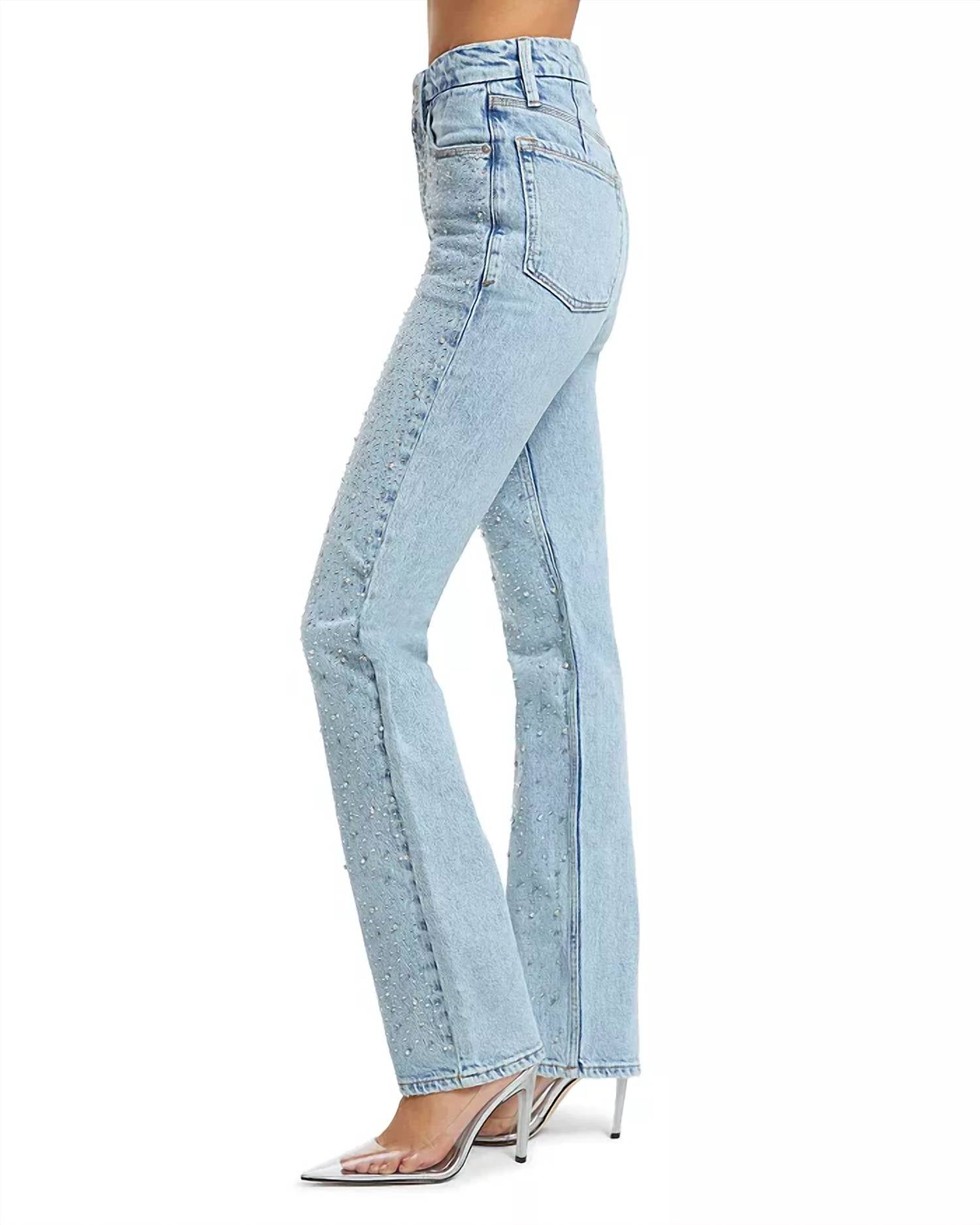 Braguilha com zíper e fecho de botão, modelo com cinco bolsos. Costura contrastante, ferragens prateadas, passantes para cinto. Enfeites de strass na frente. Lavagem azul-claro, modelo reto. 82 cm de comprimento. A modelo tem 1,78 m de altura, 84 cm de busto, 60 cm de cintura e 86 cm de quadril, e veste tamanho 38. Lavagem à máquina com água fria. 100% algodão.