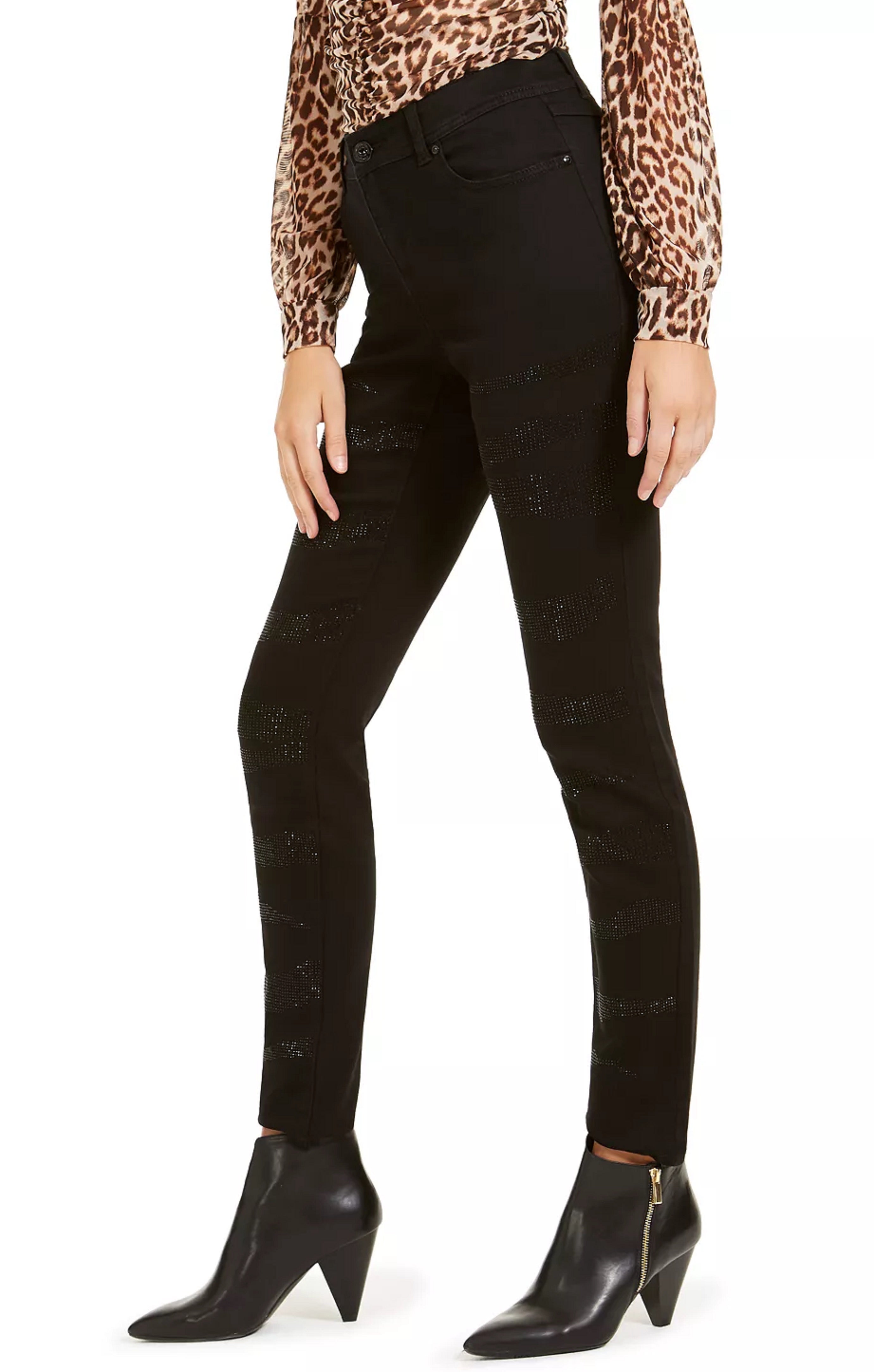 Comprimento aproximado de 31 cm | Cintura média; ajuste curvilíneo | Fecho de zíper e botão na frente; passantes para cinto | Enfeites de listras de zebra com strass | Algodão/poliéster/elastano