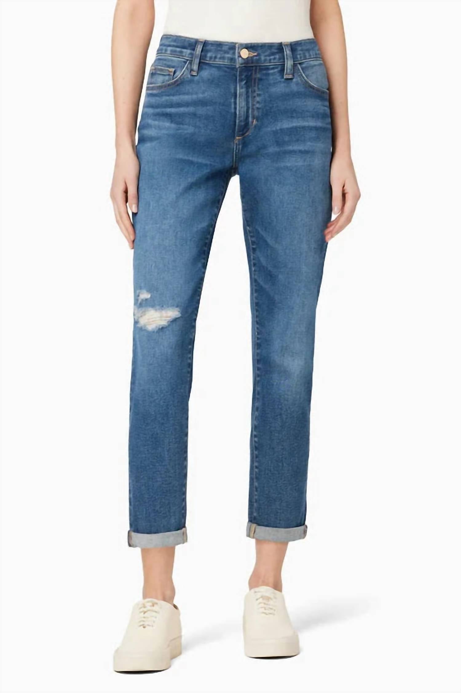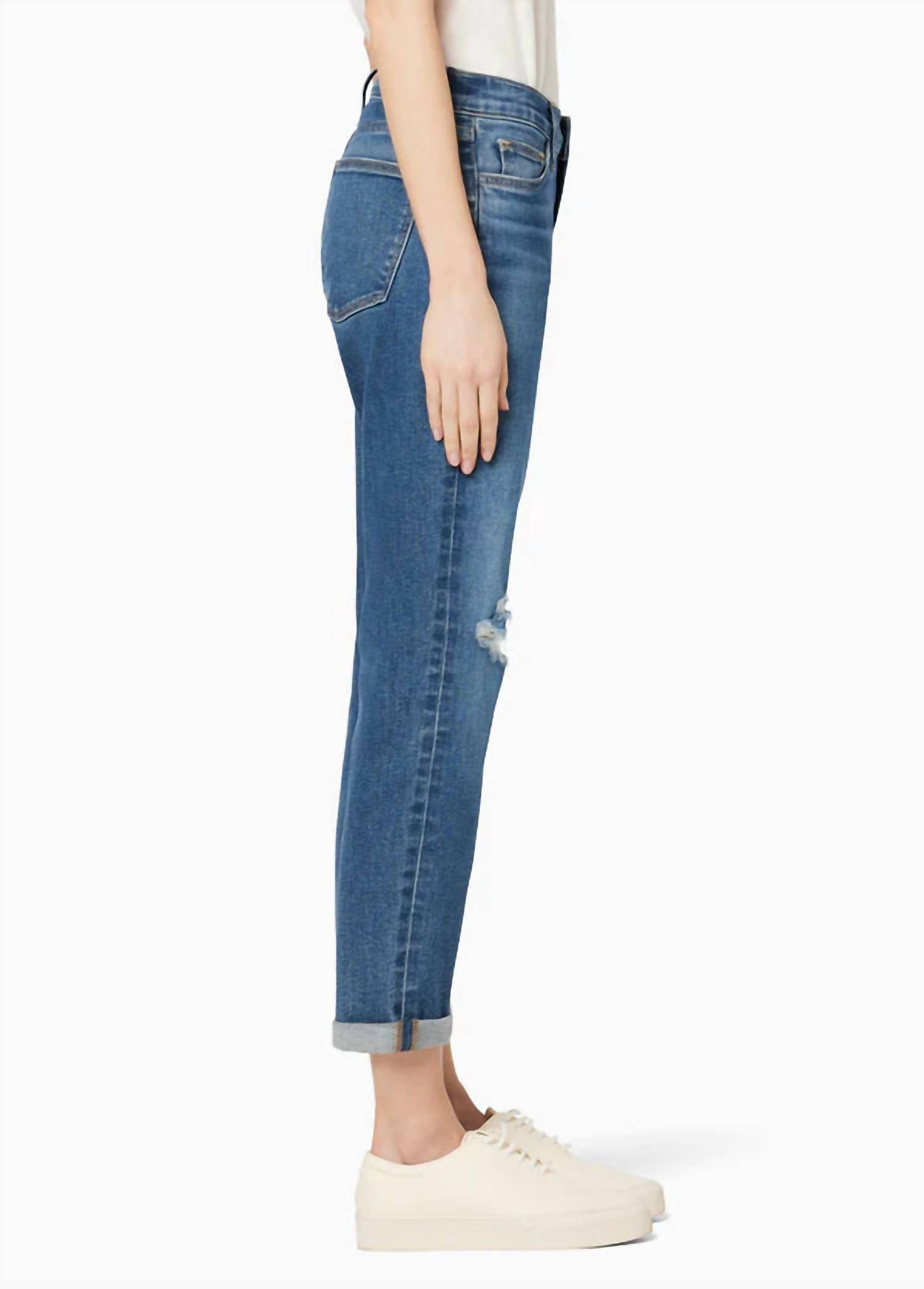 uma sensação descontraída, mas ainda surpreendentemente elegante. Eleve sua coleção de jeans com a calça Bobby Boyfriend da Joe's Jeans, perfeita para mulheres que buscam um estilo streetwear despojado. Com cintura média e perna reta, esta calça jeans é confeccionada em uma mistura de algodão composta por 93% algodão, 6% elastomultiéster e 1% elastano para proporcionar um alongamento confortável. A lavagem sustentável "Be The Light" escura-média apresenta acabamento em ribana e acabamento nos joelhos, criando um visual moderno, acentuado pelo estilo clássico de cinco bolsos e fecho de botão. Ideal para o verão, esta calça jeans é perfeita para um jantar ou para a comemoração do 4 de julho.
