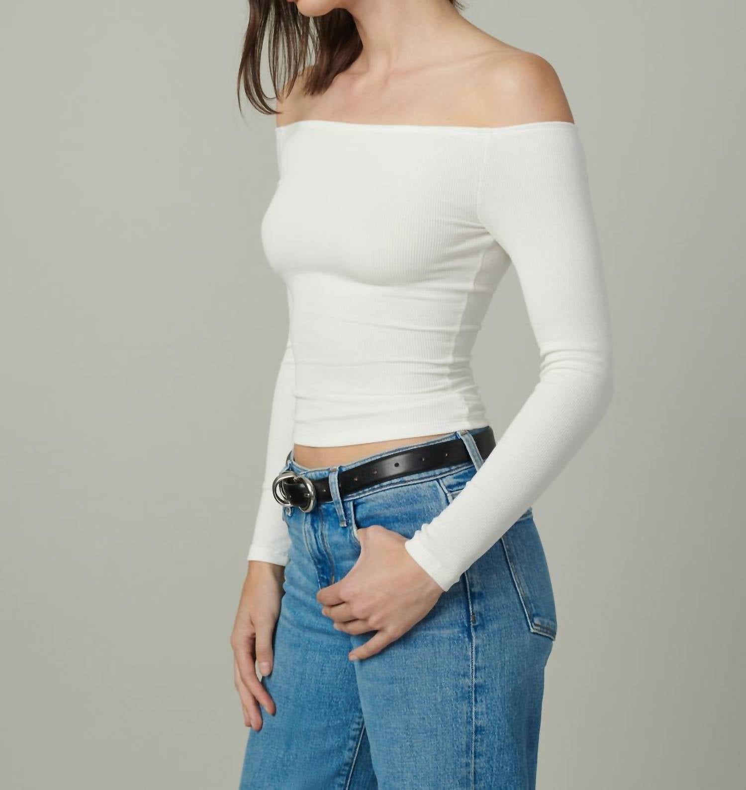 Uma blusa versátil que pode ser usada do escritório ao jantar! Esta blusa de malha de manga comprida na cor branca clássica apresenta um decote ombro a ombro estiloso e um corte justo ao corpo para uma silhueta elegante. País de origem: China. Vestir sem precisar vestir. Lavar à máquina.