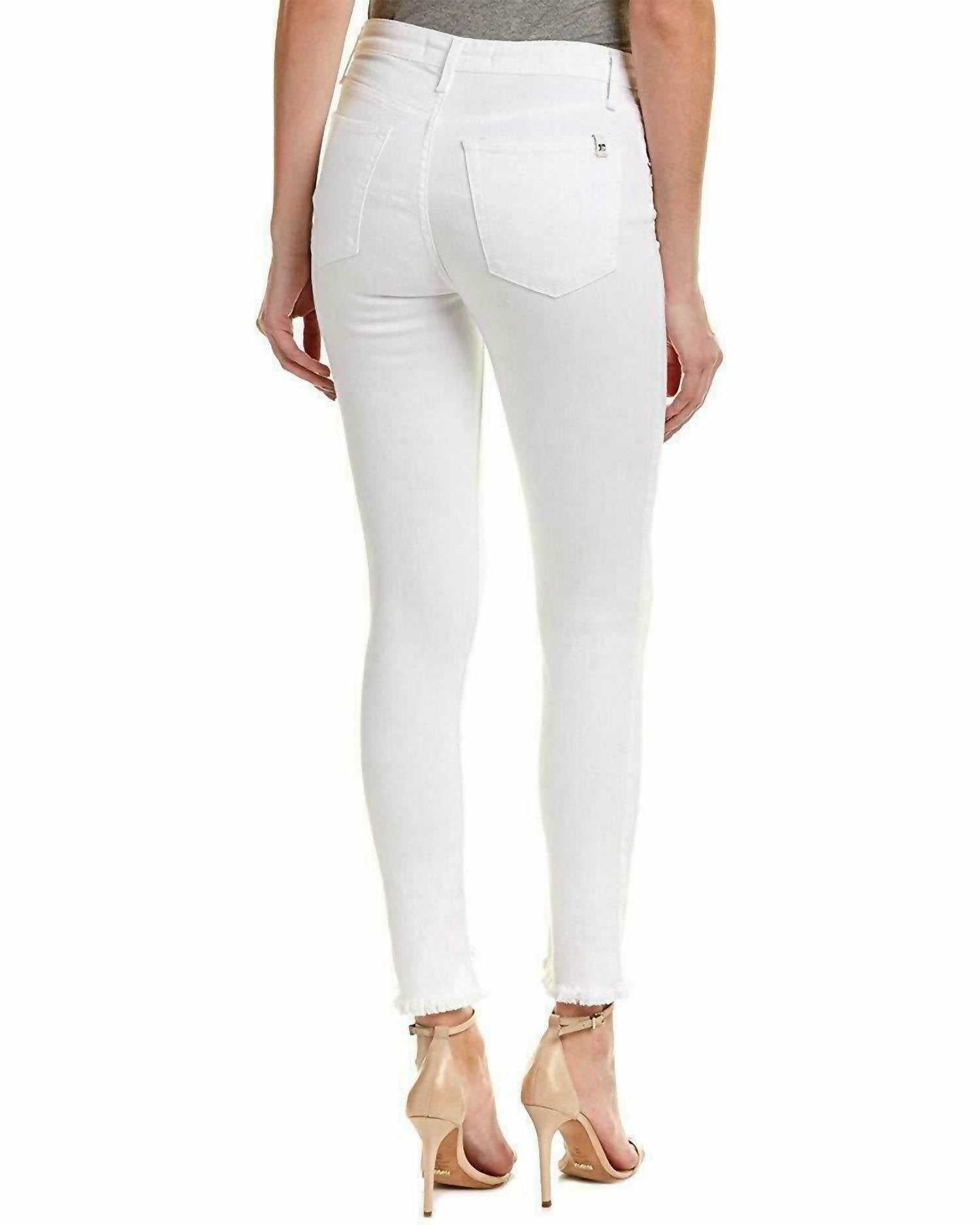 Todo mundo precisa de um bom par de jeans skinny e esse é um estilo que você vai usar sempre, não importa a estação. Apresentando a Calça Jeans Skinny Flawless Ankle Slanted Raw Hem High Rise da Joe's Jeans em um branco elegante. Esta calça jeans feminina é confeccionada em uma mistura de jeans stretch ultramacia, com 48% algodão, 45% liocel, 5% T-400 e 2% elastano. Ela apresenta cintura alta com 28 cm de altura frontal e 38 cm de altura traseira, incluindo cinco bolsos, além de braguilha com zíper e botão. A calça tem 71 cm de costura interna, 28 cm de abertura na altura do quadril e 39 cm de cintura. A bainha inclinada crua e o padrão sólido adicionam um estilo diferenciado, complementado pelas instruções de lavagem à máquina com água fria, de fácil manutenção.