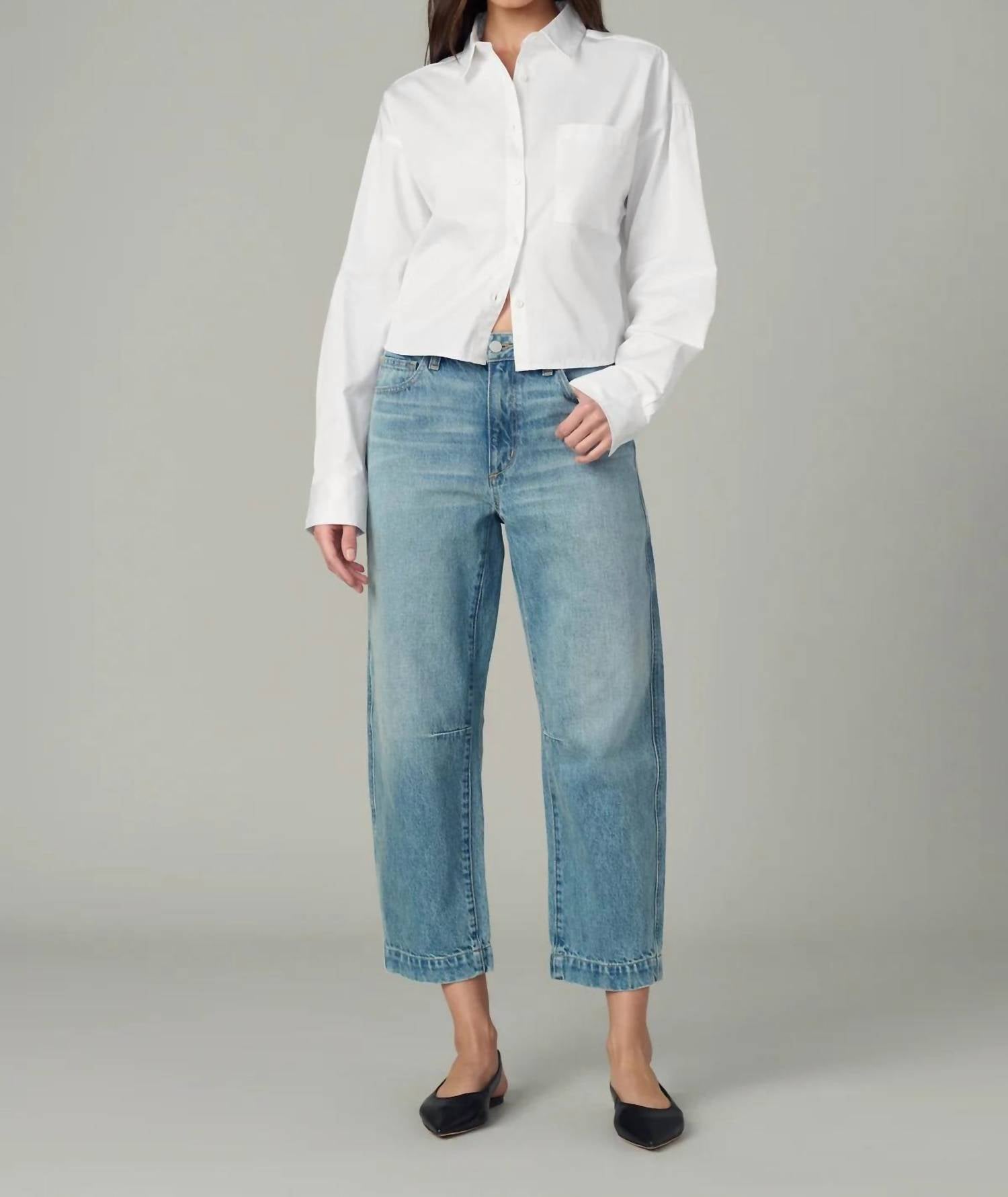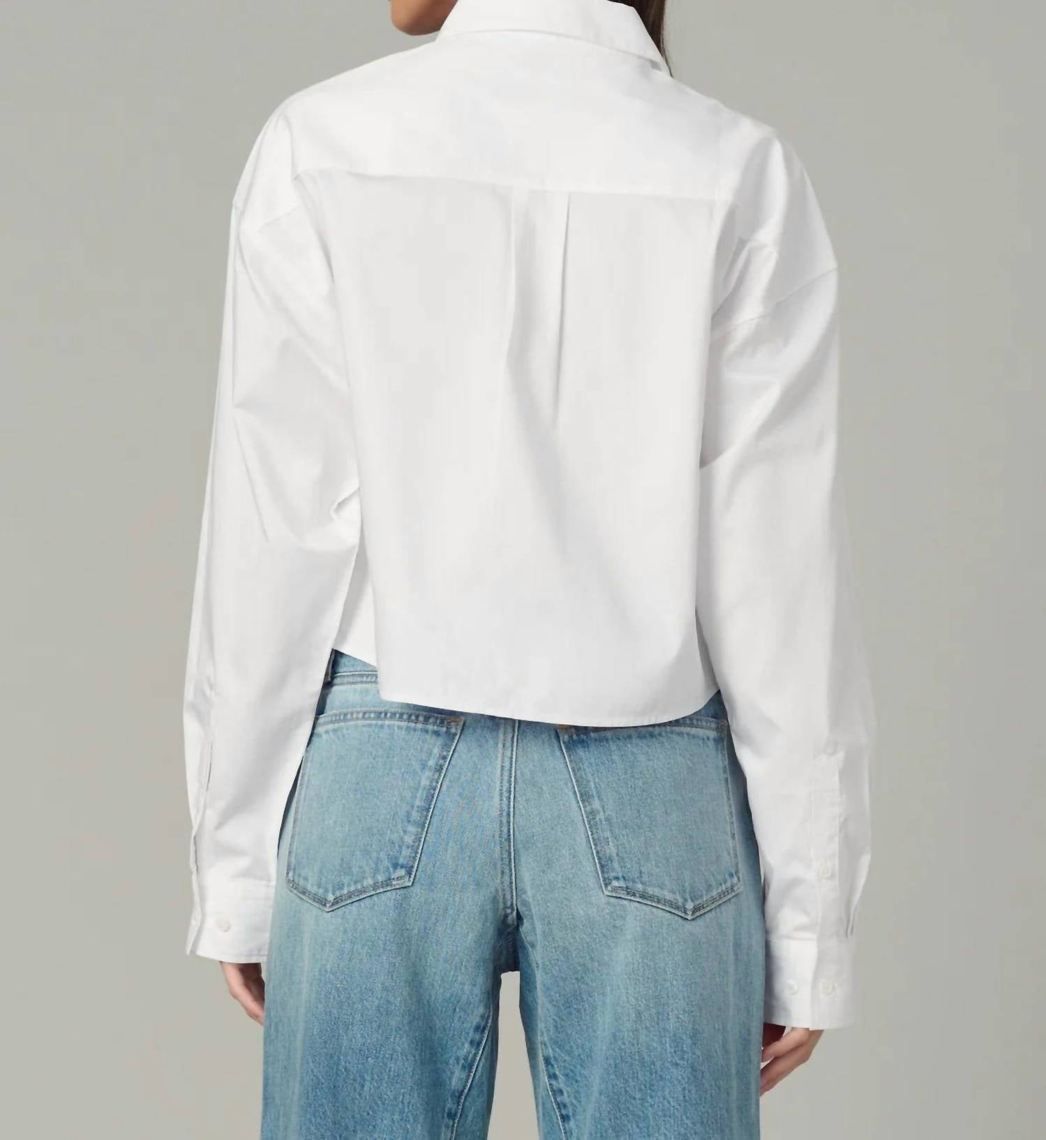 Introducing the Cropped Boyfriend Button Down Shirt by Joe's Jeans, a timeless yet modern staple for your wardrobe. With long sleeves and crafted from 100% medium-weight cotton poplin, this solid-colored shirt boasts a front chest pocket and adjustable button cuffs. This white shirt features a classic collar and button closure, perfect for effortlessly chic style. Care instructions: Hand wash and line dry.