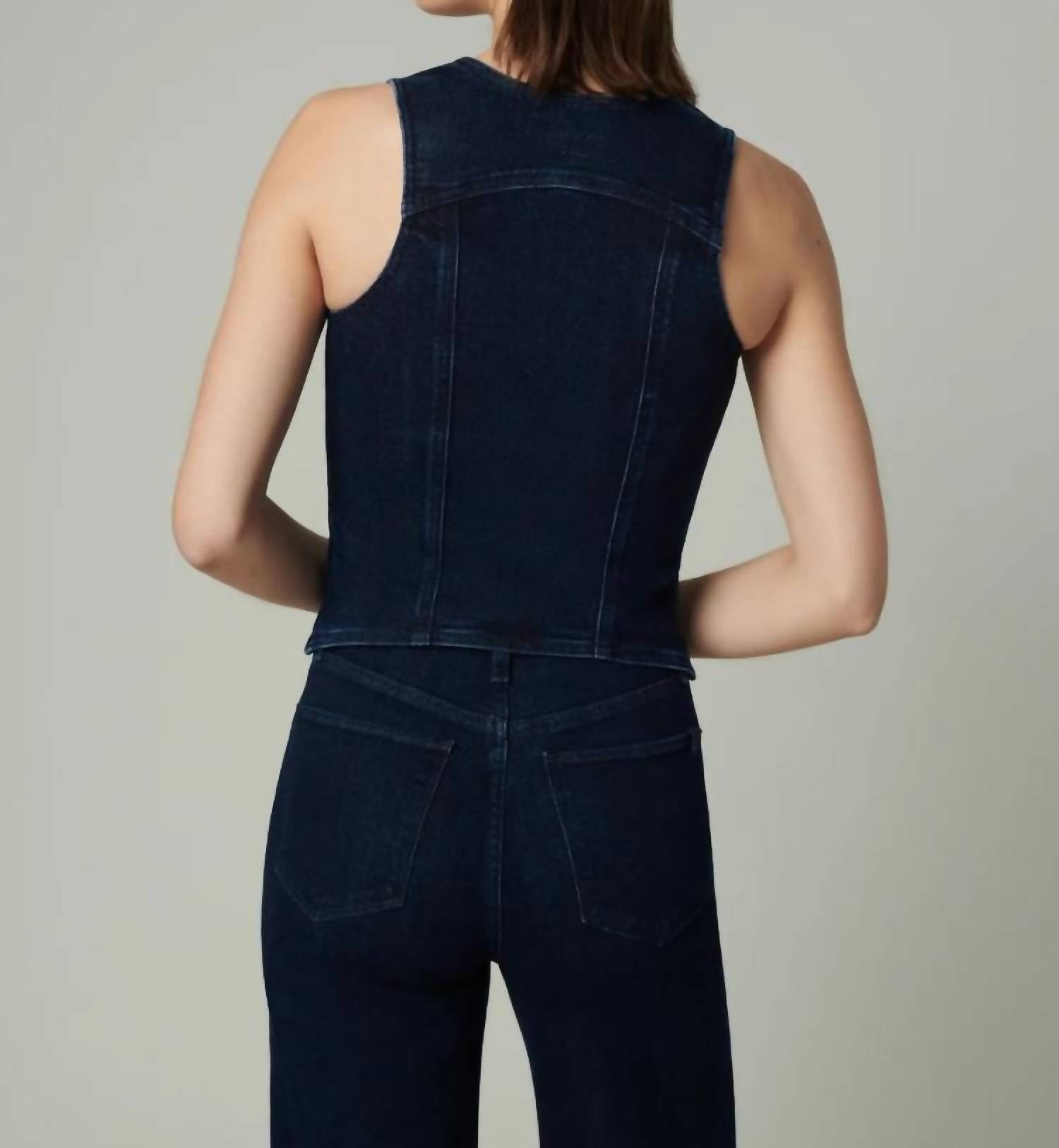 Descubra o Colete Jeans Joe's Jeans The Denim, uma peça sofisticada que eleva qualquer visual sem esforço. Este modelo sem mangas possui um decote em V profundo e é confeccionado em jeans índigo de gramatura média com elasticidade mínima, garantindo conforto e estilo. Confeccionado em 79% algodão, 20% poliéster e 1% elastano, este colete possui fecho frontal por botões e bolsos embutidos, oferecendo praticidade com um toque moderno. Cuide desta peça atemporal seguindo as instruções: Não lavar. Moa está vestindo tamanho P.