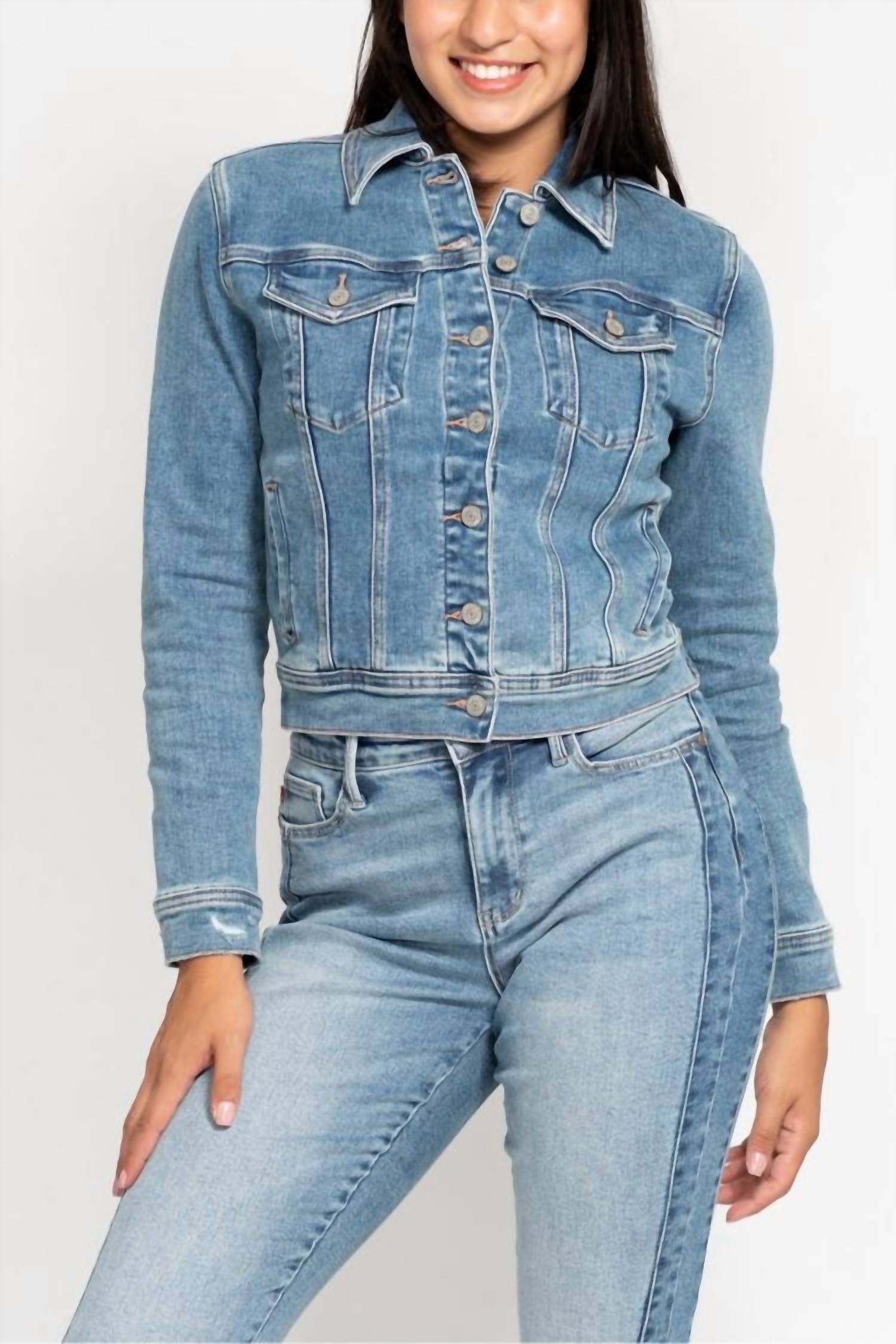 Jaqueta jeans com inspiração vintage. 76,2% algodão. 22,5% poliéster. 1,3% elastano. Conforto e elasticidade. Comprimento: 21 1/2". Visual clássico e atemporal.