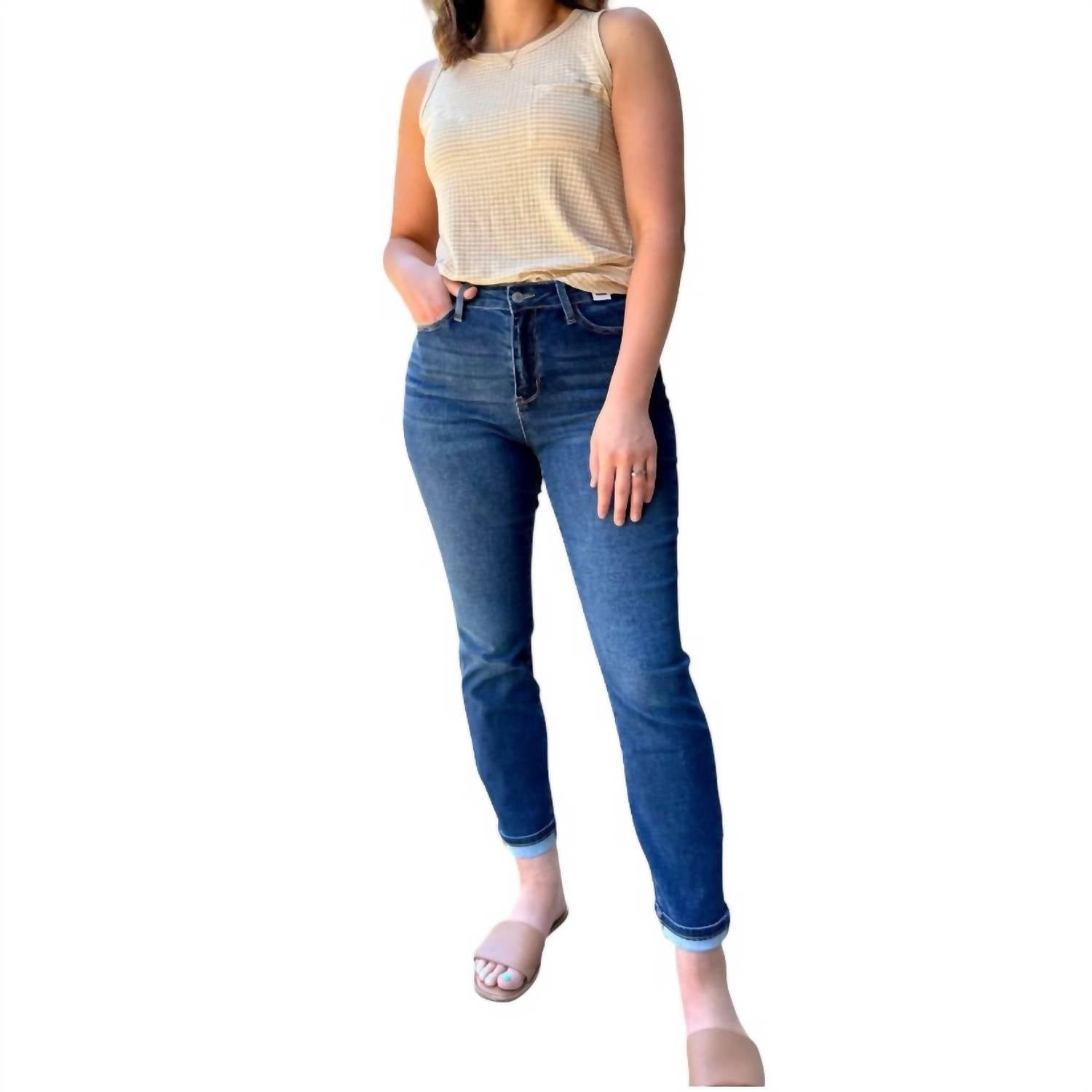 Apresentamos a Calça Jeans Cool Denim Boyfriend da Judy Blue, perfeita para viagens e estilo streetwear. Esta calça jeans azul, de corte regular, apresenta uma estampa sólida com corte skinny, realçada por um fecho de botão. Confeccionada em uma mistura de algodão — especificamente 68% algodão, 27% poliéster (Sorbtek reciclado), 3% viscose e 2% elastano —, ela promete absorver a umidade, mantendo você fresca e confortável durante todo o dia. Com 71 cm de comprimento com punho (74 cm sem punho) e 27 cm de altura, esta calça jeans pode ser lavada na máquina e seca na secadora, oferecendo praticidade e conforto.