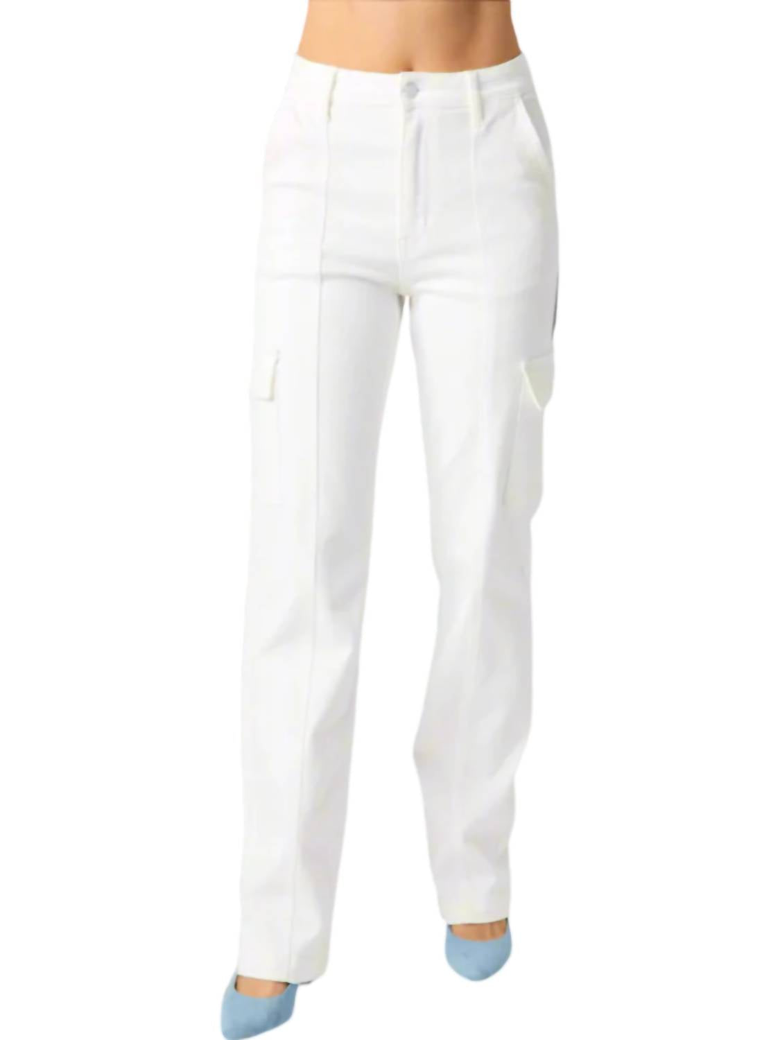Combine esta calça jeans reta com sapatilhas, sandálias ou até mesmo saltos! Não tem como errar. Fusão chique de estilo e funcionalidade. Desenhado para mulheres. Apresenta cintura alta e design de perna reta. Reforçado com bolsos cargo. Composto por 93% algodão, 6% poliéster e 1% elastano. Oferece um caimento relaxado com um visual branco sólido. Fechamento por botão e zíper. Costura interna: 32". Gancho: 12". Com um toque muito elástico e fiel ao tamanho. Proporciona versatilidade clássica para qualquer ocasião.