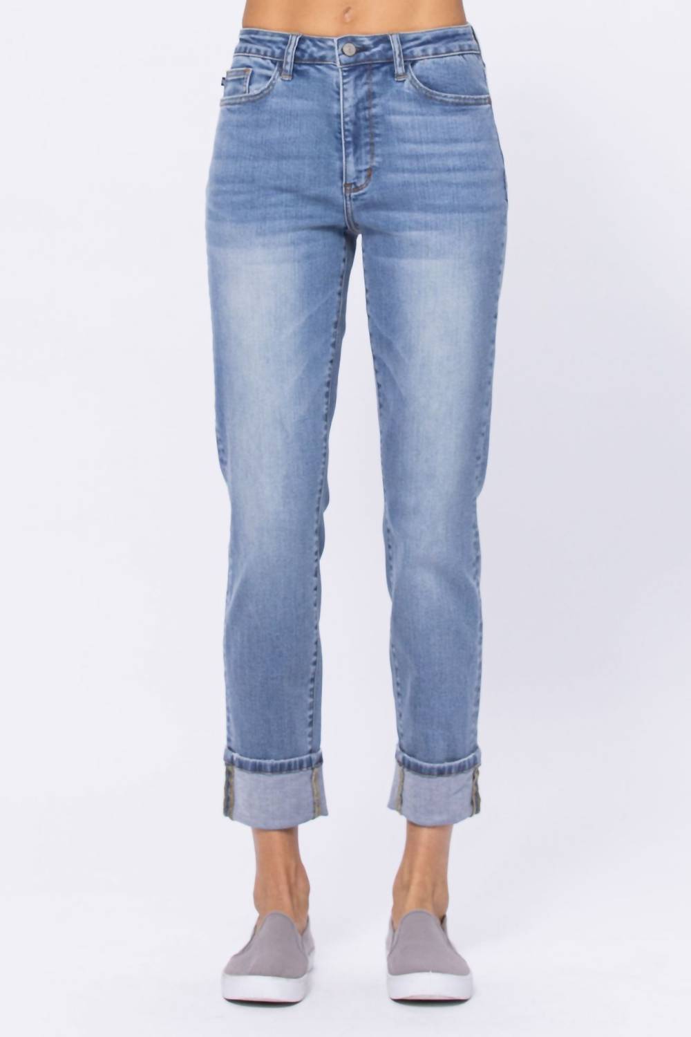 Conheça a Calça Jeans Boyfriend Vintage com Cintura Alta e Punhos da Judy Blue, uma peça essencial do streetwear em uma lavagem azul-claro. Com um corte boyfriend confortável e perna skinny, esta calça jeans é confeccionada em 92% algodão, 7% poliéster e 1% elastano, com cintura alta de 27 cm e costura interna de 10 cm para uma silhueta elegante. Fechamento: Fechamento por botão com bolsos inclusos para maior praticidade.