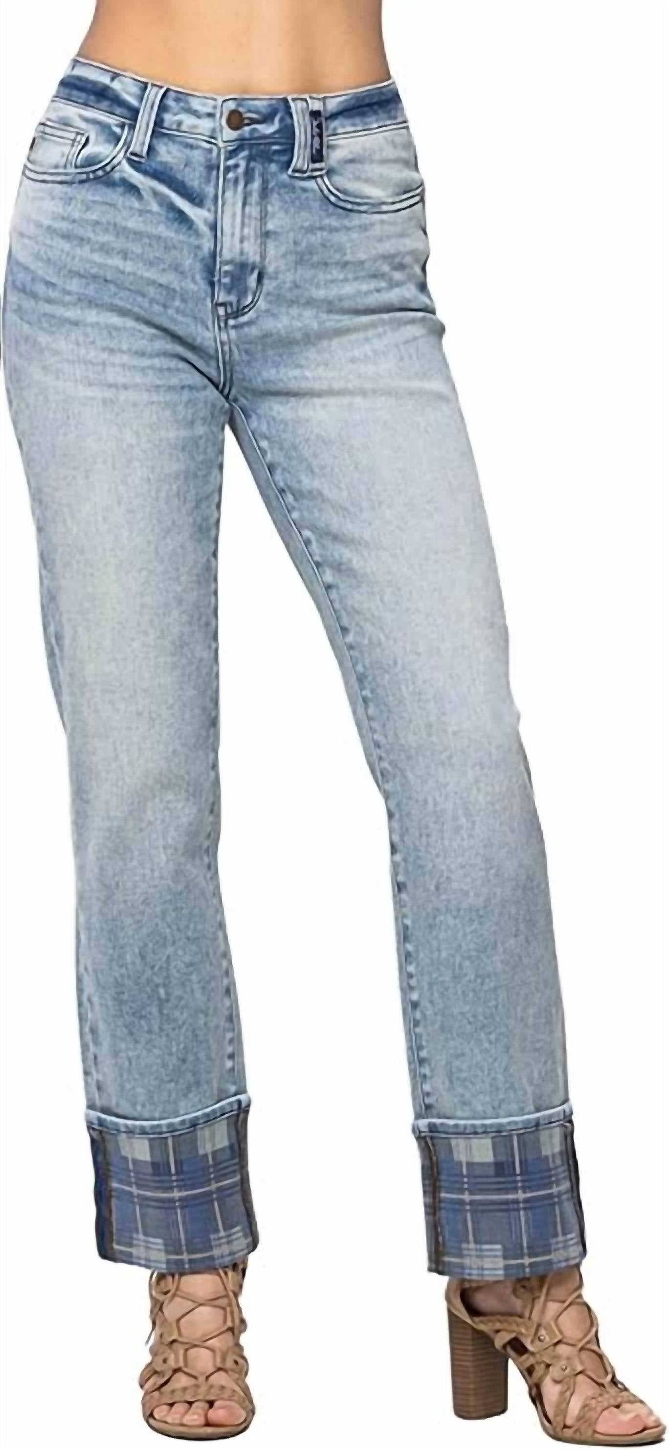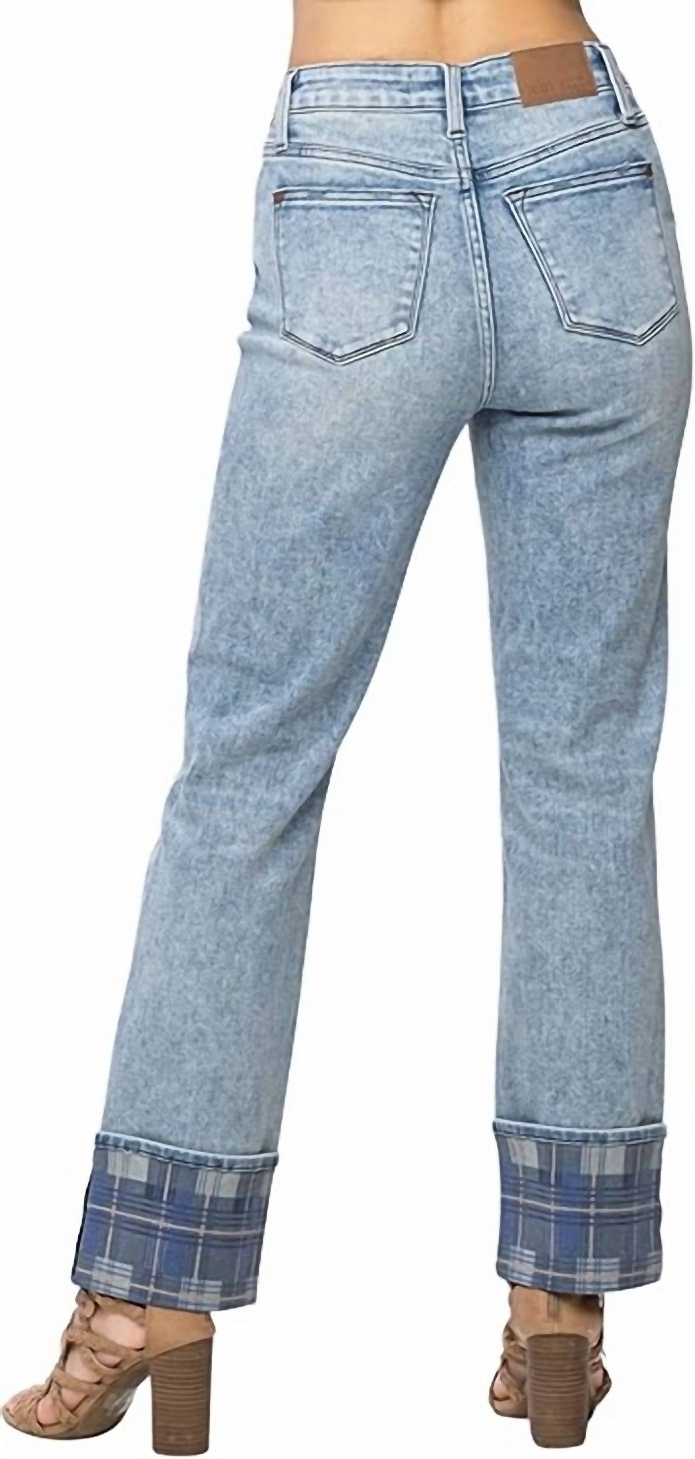 Esta calça jeans clássica de perna reta tem um caimento perfeito e combina com praticamente tudo. Tipo de fecho: zíper. Sobre este item: Cintura frontal: 27 cm. Costura interna: 75 cm com punho | 86 cm sem punho. Cintura alta. Punho com estampa xadrez. Caimento reto. 94% algodão, 5% poliéster, 1% elastano. Instruções de cuidado: Lavar à máquina. Origem: importado.