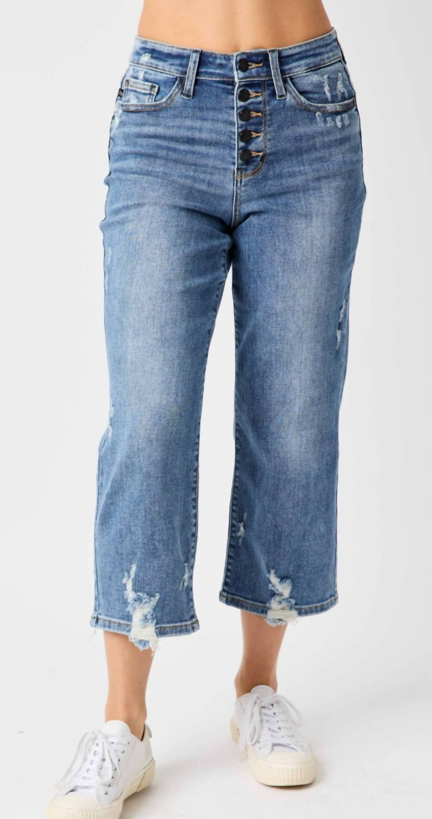 A calça cropped Judy Blue de cintura alta com botões apresenta leve desgaste, bolsos, passantes para cinto e fecho de botão. Confeccionada em 93% algodão, 6% poliéster e 1% elastano. O cós é de 28 cm e a costura interna mede 60 cm. Lavável à máquina.