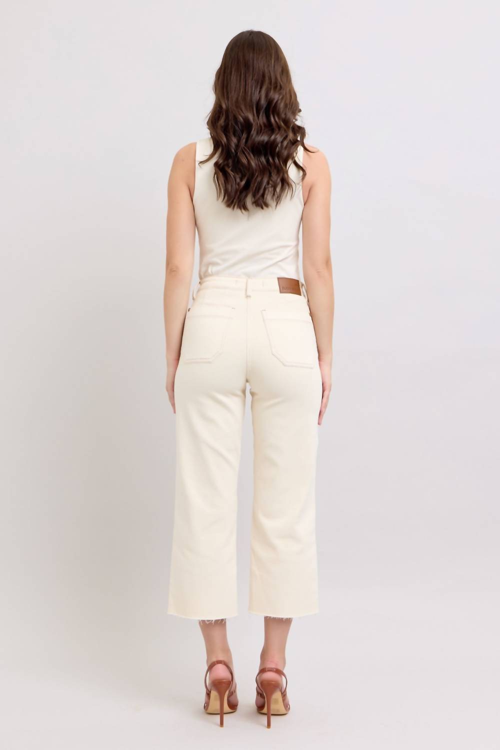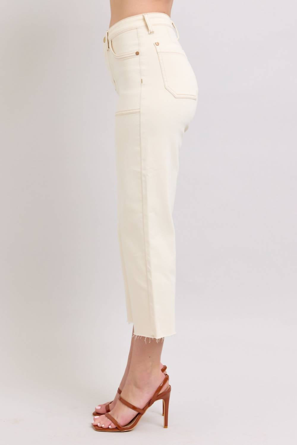 Uma silhueta elegante e surpreendentemente versátil. Eleve seu visual com a Calça Jeans Judy Blue de Cintura Alta e Larga, na elegante cor Cru, um complemento perfeito para o seu guarda-roupa de primavera. Este jeans sólido e de caimento relaxado é confeccionado em uma mistura de 93% algodão, 6% poliéster e 1% elastano, com um cós alto de 28 cm e um prático fecho de botão. O modelo cropped de perna larga tem costura interna de 62 cm, tornando-o versátil para diversas ocasiões. Os bolsos adicionam funcionalidade e a calça é fácil de cuidar — basta lavar na máquina e secar na secadora.