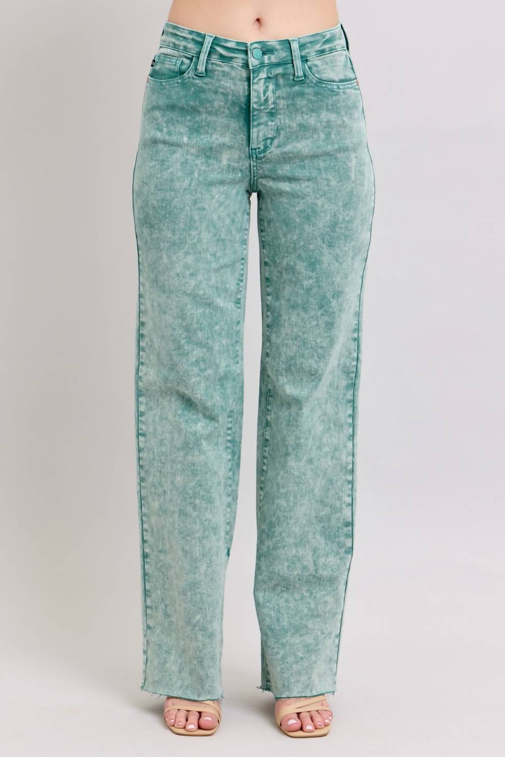 Fit to perfection, we love these high-waist jeans and you will too. Embrace the Boho Chic trend with the High Waist Dad Jeans by Judy Blue, perfect for your spring wardrobe. These solid, sea green jeans feature a high-rise fit with a relaxed straight leg and raw hem, offering a flattering silhouette. Made from soft stretch denim, they promise comfort and flexibility with every wear. Closure: Zip closure. Care: Machine wash and tumble dry. Available in regular and plus sizes with a light denim wash and functional pockets. Perfect for occasions like a dinner party or Thanksgiving. Regular Size: Rise 10.75", Inseam 32.5". Plus Size: Rise 12", Inseam 32.5".