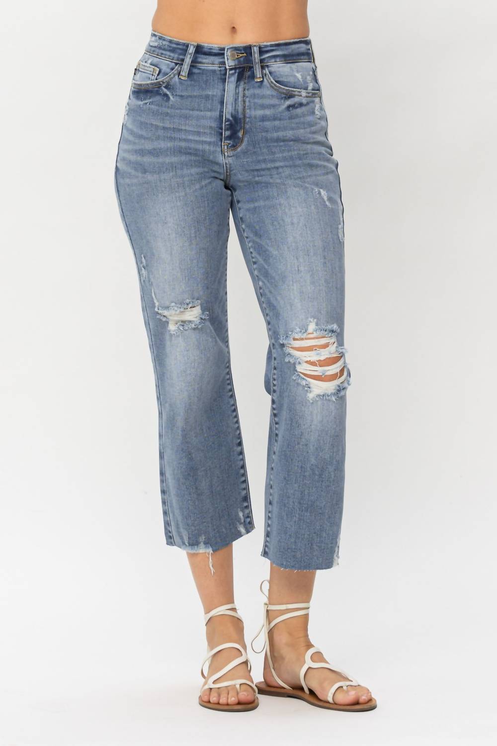 Confortável e estiloso, amamos esse jeans cropped por todos os motivos óbvios. Experimente o estilo streetwear despojado da Calça Jeans Destroyed Crop Wide Leg de Cintura Alta da Judy Blue, em azul sólido. Esta calça jeans feminina apresenta um corte relaxado com perna reta e cintura alta, oferecendo uma lavagem leve e moderna, perfeita para ocasiões de primavera. Confeccionada em 93% algodão, 6% poliéster e 1% elastano, ela promete conforto e flexibilidade com costura interna de 62 cm e cós de 28 cm. Projetada com praticidade em mente, ela inclui bolsos e fecho de botão seguro. Cuide desta calça jeans com facilidade lavando-a na máquina e secando-a na secadora.