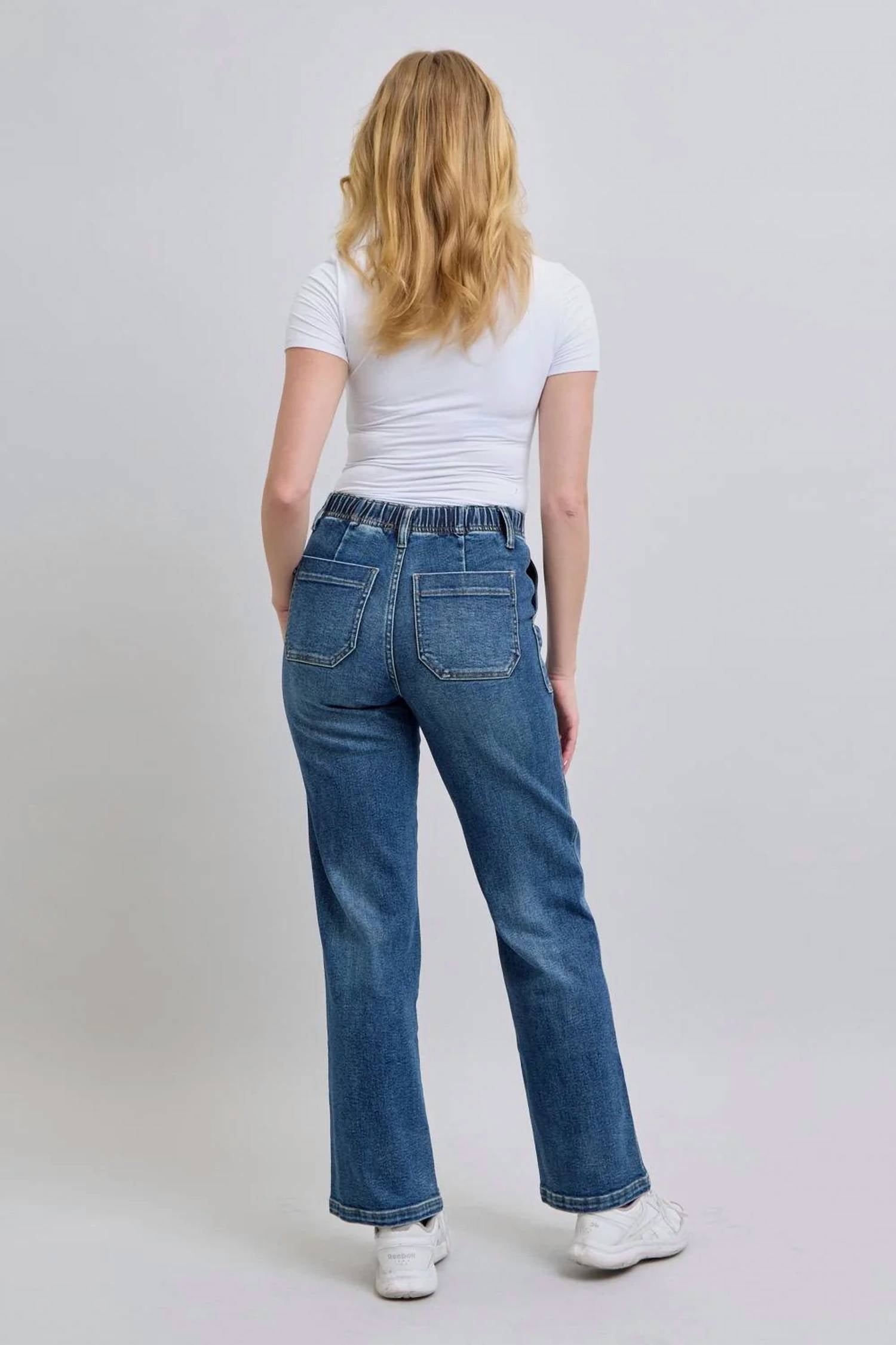 Introducing the High Waist Drawstring Wide Leg Jeans by Judy Blue, crafted in medium denim for a flattering fit. This wide-leg design begins to flare around the mid-thigh, accentuating your silhouette with a 12.75" front rise and a 32" inseam. Composition: 94% Cotton, 5% Polyester, 1% Spandex. Closure: Zip closure. Care: Machine wash. Designed for women, available in plus sizes 14W to 24W, complete with pockets for functionality.
