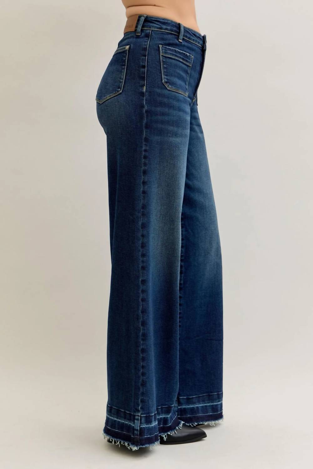 Pair these wide leg jeans with mules, slides or your favorite strappy sandals. Elevate your wardrobe with the Judy Blue High Waist Palazzo Jeans in a classic medium wash blue, perfect for everything from stylish days out to casual weekends. Crafted from a cotton blend (94% Cotton, 5% Polyester, 1% Spandex), these jeans offer a high waist rise for a flattering silhouette, complete with trendy front patch pockets. The palazzo wide-leg cut and soft stretch ensure both comfort and chic style, with a 33" inseam ideal for pairing with boots, heels, or platforms. Closure: Button closure. Care: Machine wash, tumble dry. Model 1 wears size 3 (5'9" height, 25.5" waist, 38.5" hips); Model 2 wears size 14W (5'10" height, 36" waist, 50" hips).