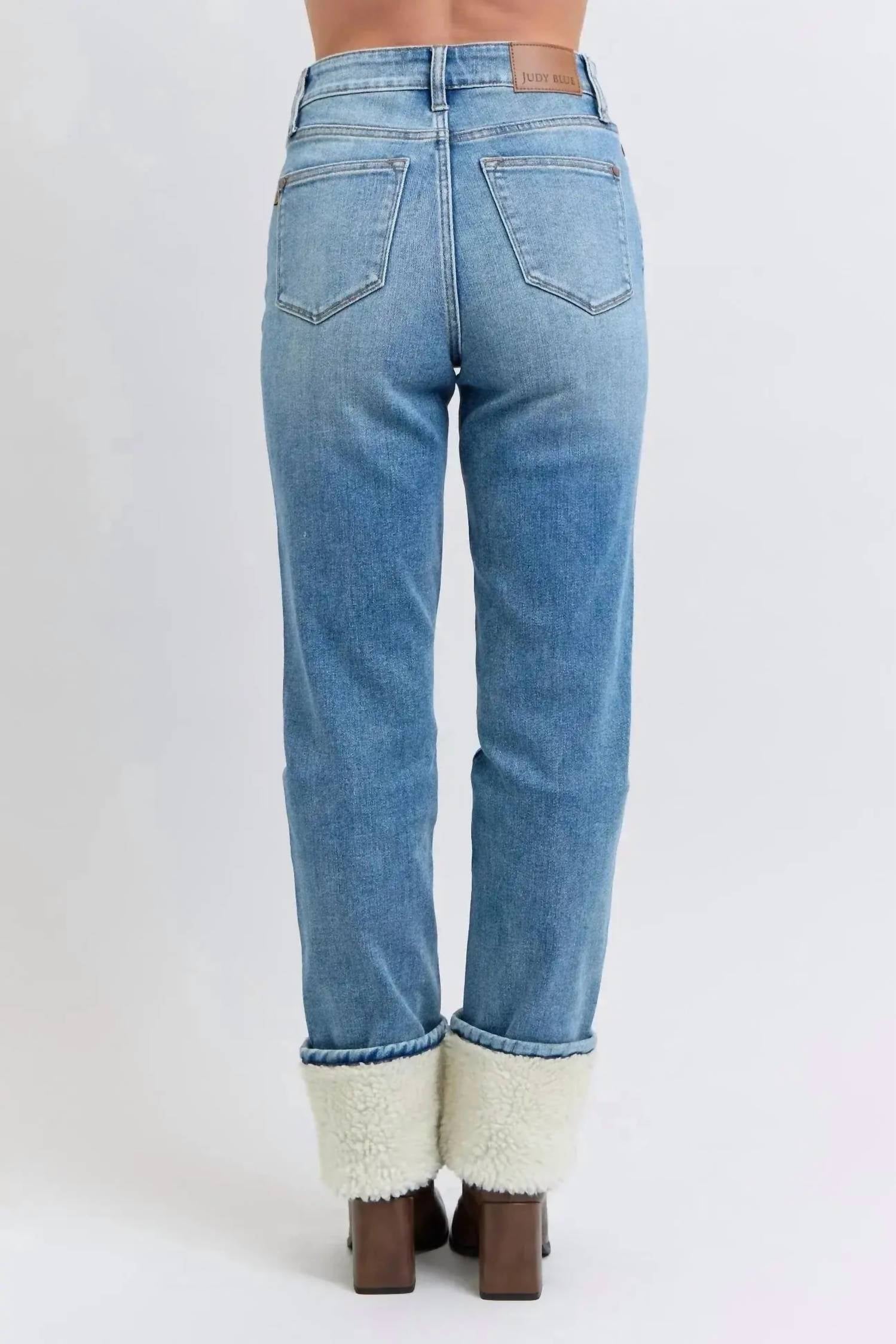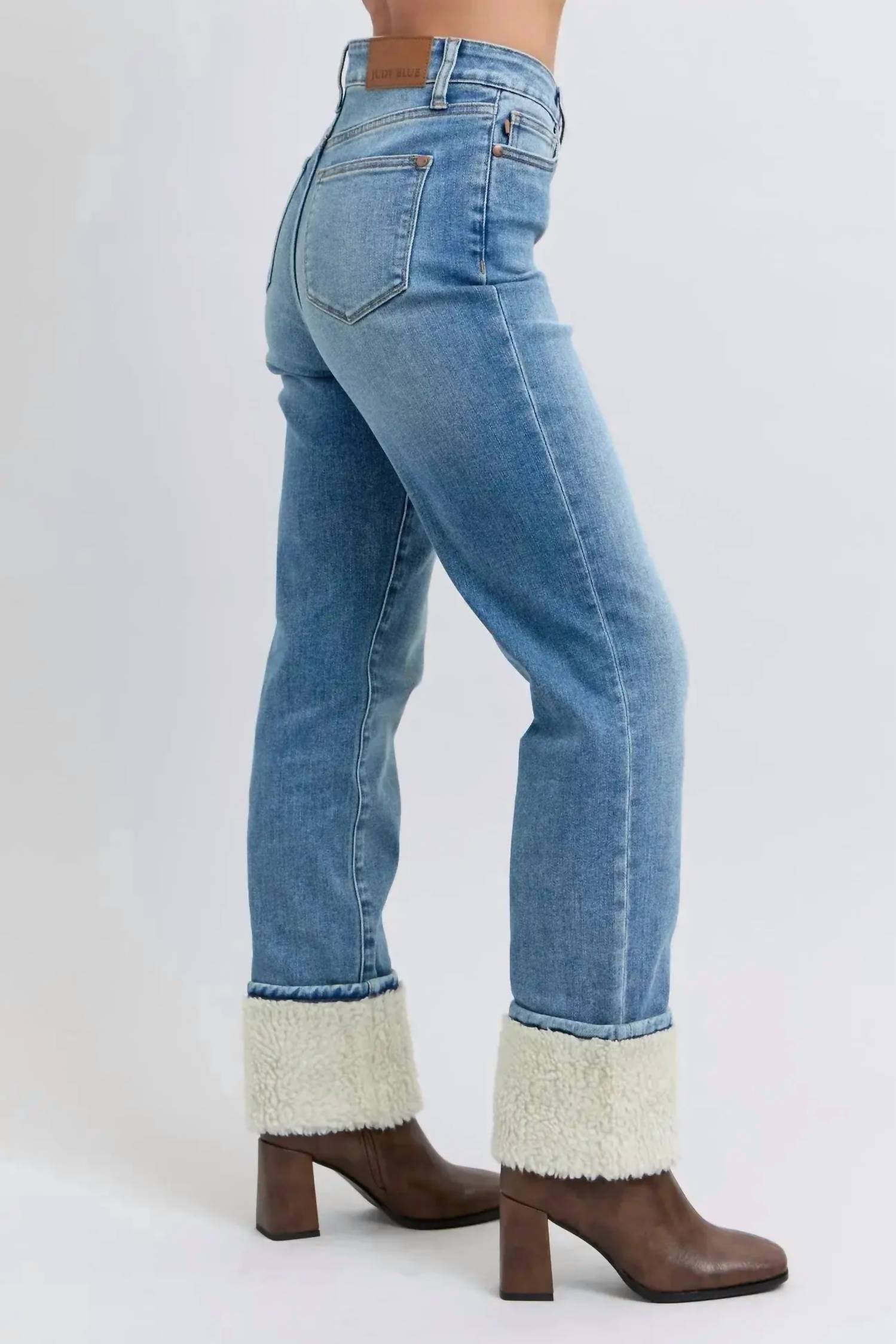 Judy Blue - Calça jeans reta com punho de pele de carneiro e cintura alta