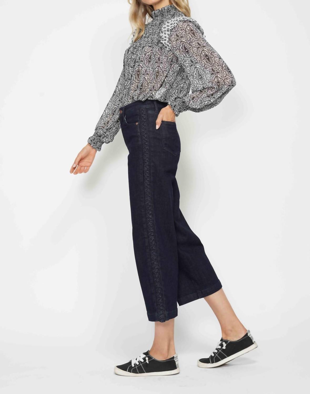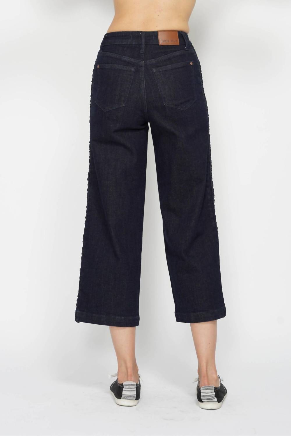 Combine esta calça jeans de perna larga com mules, slides ou suas sandálias de tiras favoritas. Eleve seu guarda-roupa casual com a Calça Jeans de Cintura Alta com Detalhe de Trança Lateral da Judy Blue, confeccionada em um tom preto elegante e perfeita para ocasiões casuais. Confeccionada em 92% algodão, 6% poliéster e 2% elastano, esta calça promete um caimento confortável e flexível. Com cintura alta e perna larga com fecho de botão, esta calça apresenta um sofisticado detalhe de trança lateral com dimensões que incluem 28 cm de altura e 63 cm de costura interna.