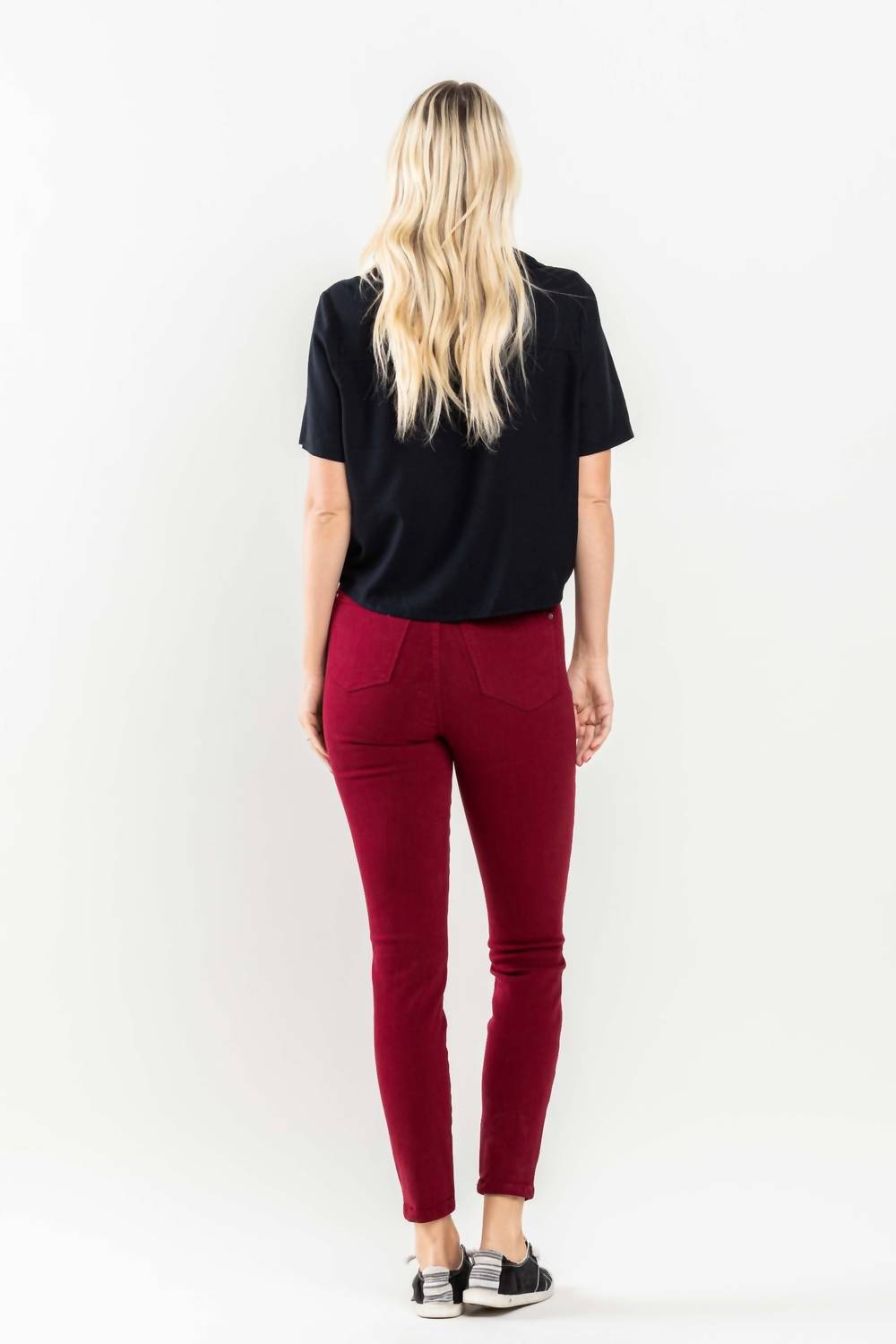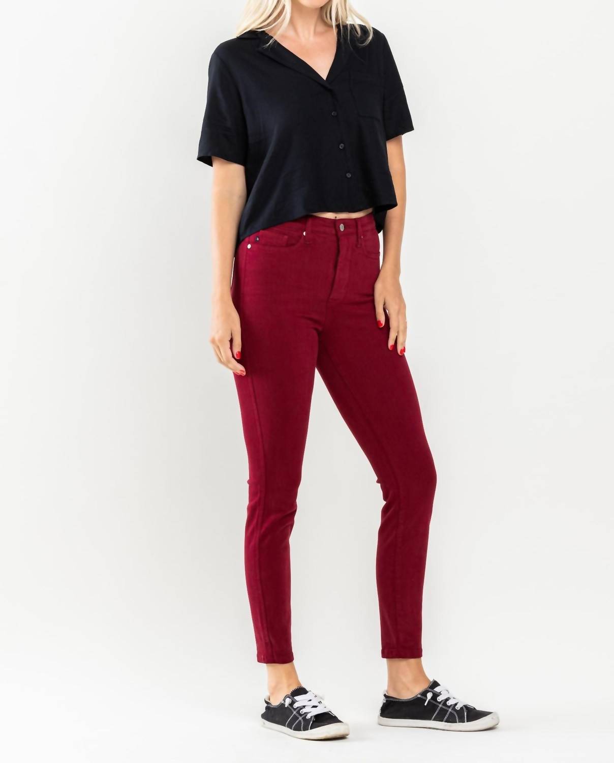 Todo mundo precisa de um bom par de jeans skinny e esse é um estilo que você vai usar sempre, não importa a estação. Apresentamos a Calça Jeans Skinny com Controle de Barriga e Cintura Alta Judy Blue, um item essencial em qualquer guarda-roupa, em vermelho vibrante. Esta calça jeans tem modelagem justa da coxa ao tornozelo, com cintura alta para maior controle da barriga. Composição: 93% Algodão, 6% Poliéster, 1% Elastano. Fechamento: Botão. O cós frontal mede 28 cm e a costura interna tem 73 cm. Cuidados: Vire do avesso e lave em água fria. Não misture lavagens claras com escuras, seque ao ar livre ou na secadora em temperatura baixa. A modelo veste tamanho 1, mede 1,78 m, tem 61 cm de cintura e 86 cm de quadril.