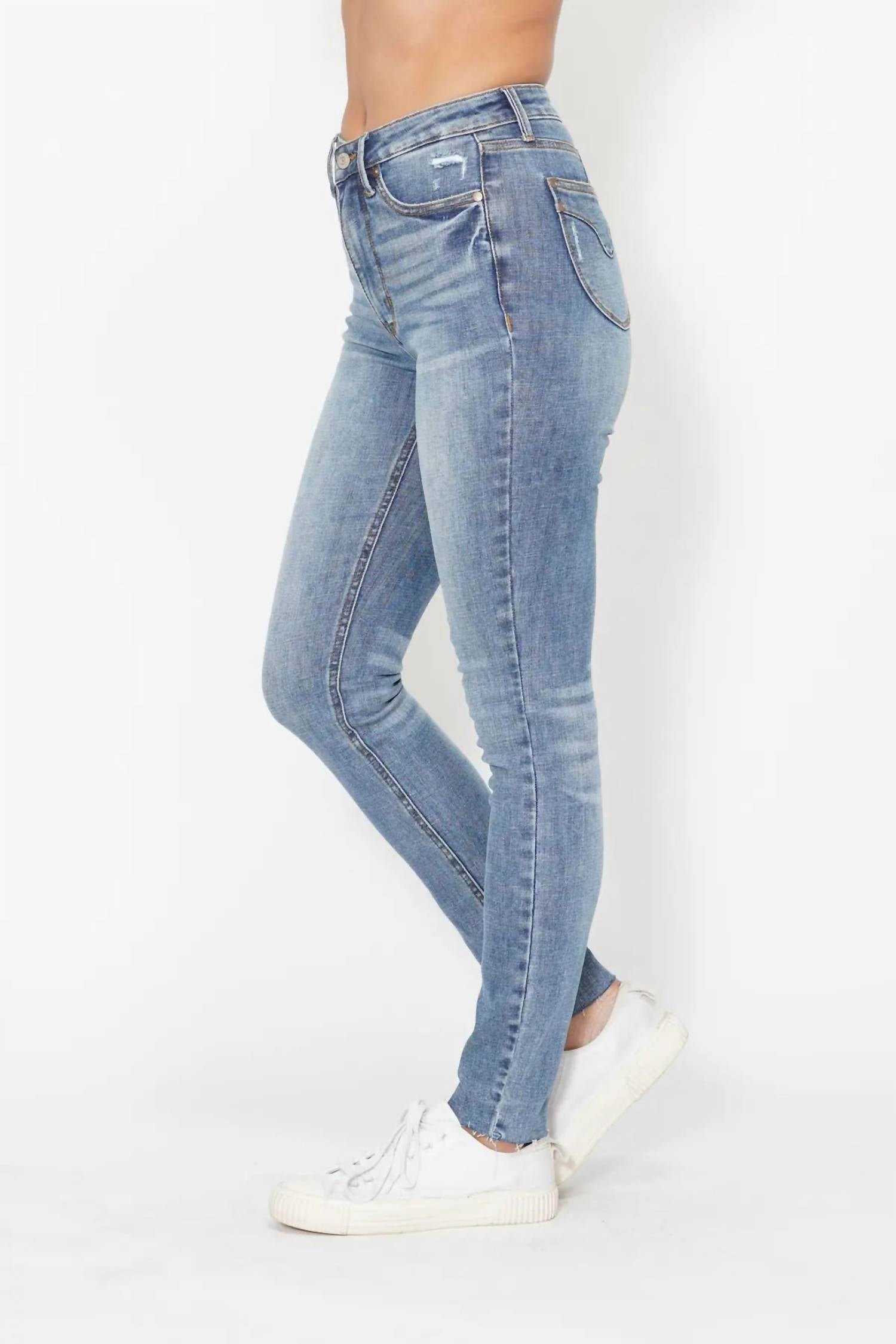 Descubra a Calça Jeans Skinny Vintage com Bolso Escudo e Cintura Alta Judy Blue, perfeita para quem busca conforto e estilo. Confeccionada com cintura alta e design que controla a barriga, esta calça promete um caimento perfeito com uma silhueta esculpida. Confeccionada com uma mistura de 91% algodão, 7% poliéster e 2% elastano, oferece lavagem média, visual levemente desgastado, com bainha crua e detalhe exclusivo de bolso escudo. Com costura interna de 73 cm e cós de 28 cm, esta calça fecha com um botão e tem um corte skinny clássico que permanece confortável o dia todo.