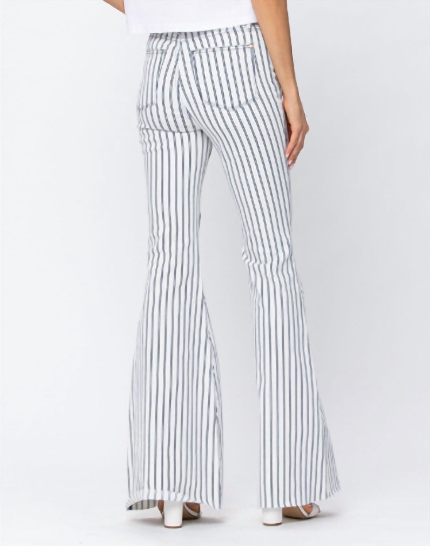 Elevate your wardrobe with the High Waist White Pin Stripe Super Flare Jeans by Judy Blue, a nod to 90s fashion with a modern twist. These denim jeans feature a high rise and a flared leg design, offering a flattering slim fit. Made from a blend of 64.7% Cotton, 21% Rayon, 12.9% Polyester, and 1.4% Lycra, they promise comfort without compromising style. Closure: Zip closure. Care: Machine wash and tumble dry. With a 35.5" inseam, they're perfect for a chic spring dinner party or festive 4th of July celebration.