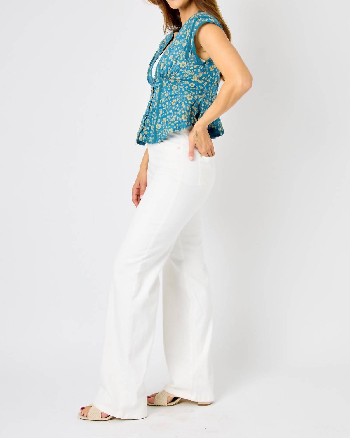 Pair these wide leg jeans with mules, slides or your favorite strappy sandals. Elevate your wardrobe with the High-waisted Braided Detail Wide Leg Jeans by Judy Blue, perfect for both casual and dressy ensembles. These stylish jeans showcase a high-rise waist and wide-leg design, featuring a beautiful braided detail in crisp white. With a relaxed fit and a comfortable composition of 93% Cotton, 6% Polyester, and 1% Spandex, they ensure a flattering silhouette. Closure: Button closure. Care: Machine wash, tumble dry. Key measurements include a 33.5” inseam and an 11” rise.