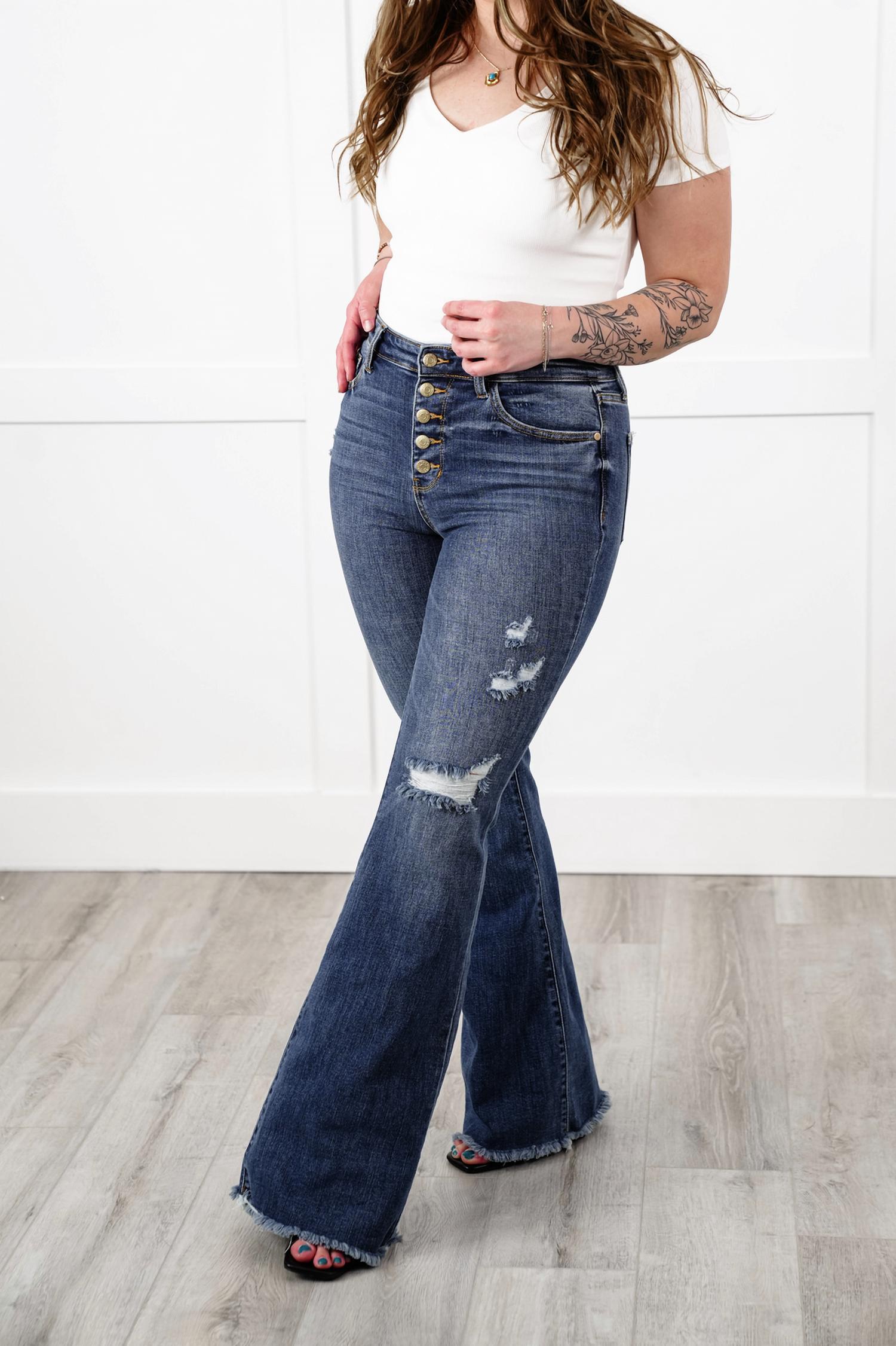 Uma silhueta elegante e surpreendentemente versátil. Apresentamos a Calça Jeans Flare Judy Blue de Cintura Média com Botões e Braguilha, com uma lavagem média estilosa, perfeita para elevar o seu guarda-roupa streetwear. Confeccionada em uma confortável mistura de algodão, esta calça apresenta modelagem regular com cós médio e um elegante cós de 26 cm. Com corte flare e costura interna de 84 cm, ela adiciona um toque ousado com sua bainha desfiada e efeito desgastado. Projetada pensando na praticidade, possui bolsos e fechamento por zíper. Cuidados: Lavar à máquina e secar na secadora.