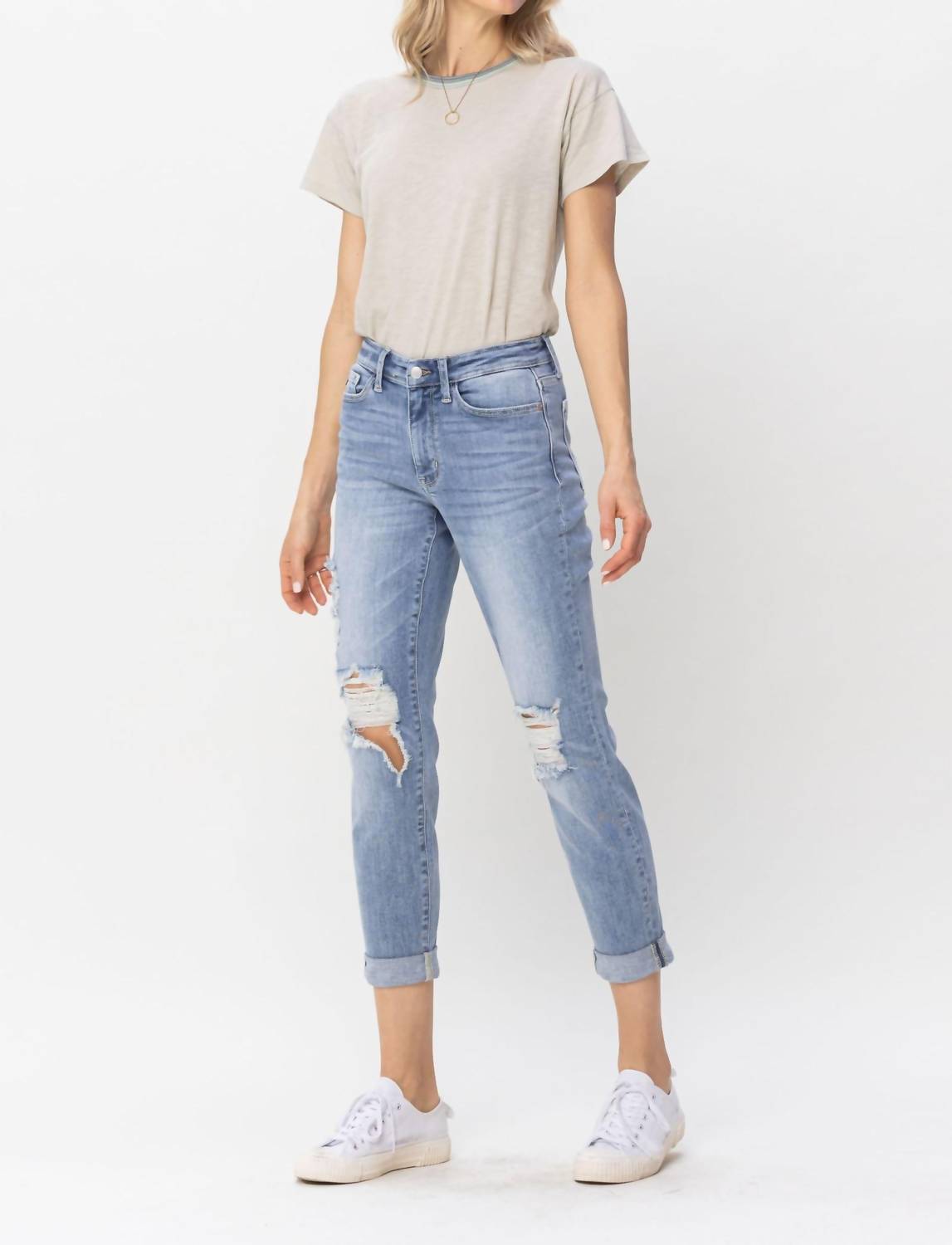 Apresentamos a Calça Jeans Boyfriend Destroyed Judy Blue com Cintura Média e Punho Duplo, uma peça essencial para qualquer guarda-roupa casual. Confeccionada em uma mistura confortável de 93% algodão, 6% poliéster e 1% elastano, esta calça jeans apresenta uma lavagem leve e estilosa e um corte boyfriend solto para um estilo despojado. Com cós frontal de 24 cm e opções de costura interna de 68 cm com punho ou 76 cm sem punho, você desfrutará de uso versátil e cobertura. Tipo de fecho: Botão. Cuidados: Vire do avesso e lave em água fria; não misture lavagens claras com escuras; seque ao ar livre ou na secadora em temperatura baixa. Informações da Modelo: Tamanho 1, 1,75 m de altura, 61 cm de cintura, 86 cm de quadril.