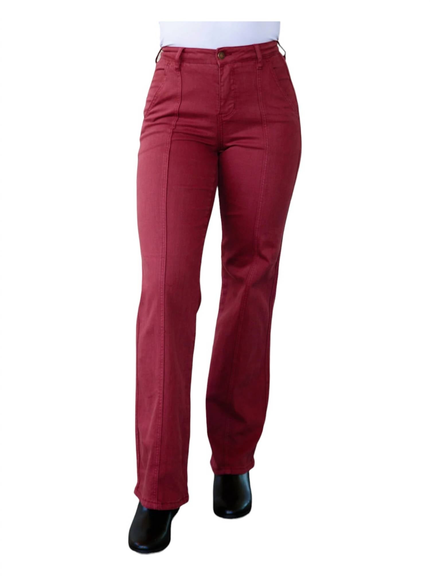 Cintura alta. Braguilha com zíper. Tingido na peça. Costura frontal central. Pernas retas. 93% algodão, 6% poliéster, 1% elastano.