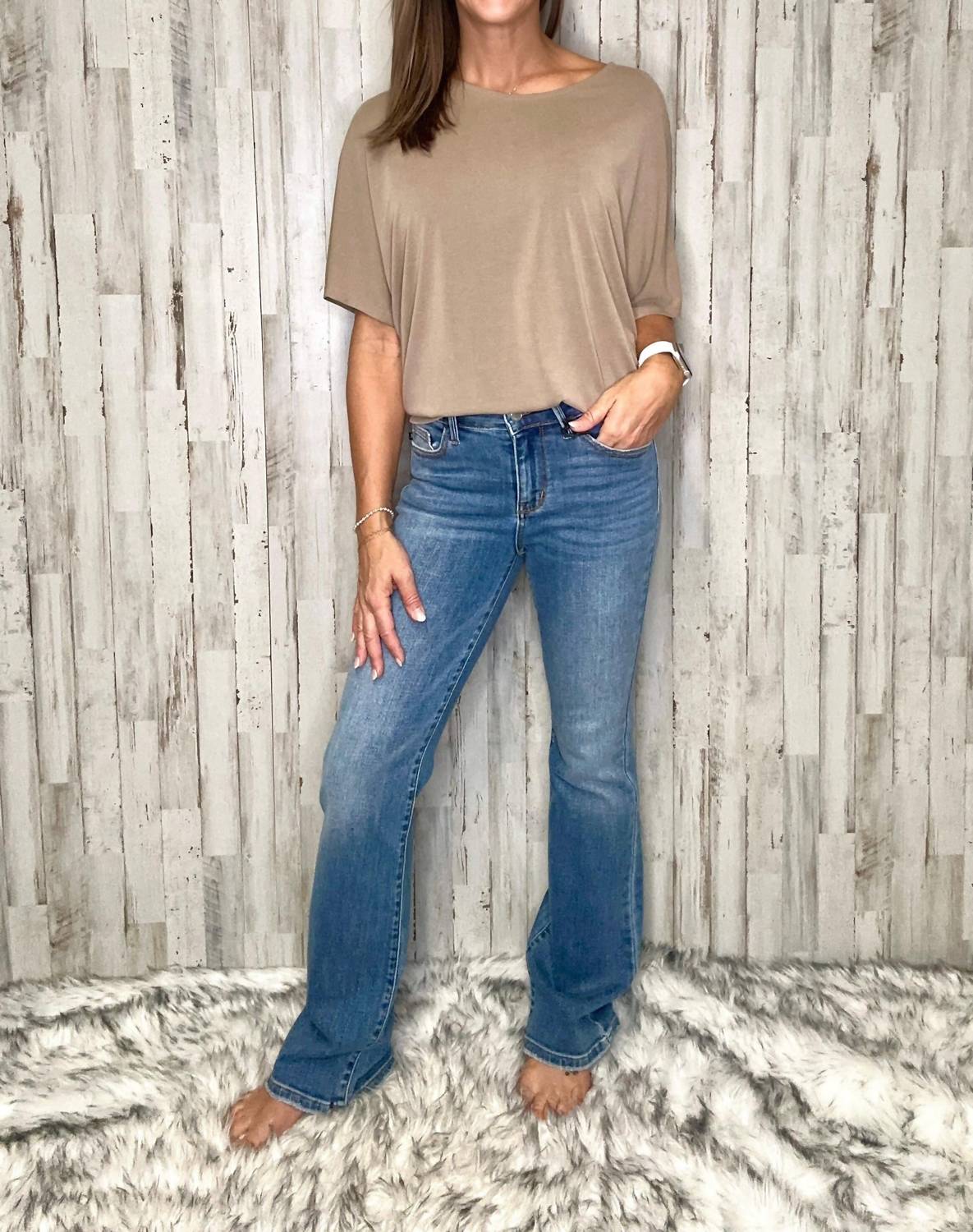 Stay on trend with these stylish boot cut pants that are fit to perfection. The perfect combination of comfort and fashion, you'll be grabbing for these all season long! Introducing the Sammy Mid-rise Boot Cut Jean by Judy Blue, expertly crafted for both style and comfort. These jeans offer a flattering mid-rise, relaxed fit, and bootcut leg in a solid blue color, perfect for any occasion. Made from a durable blend of 93% Cotton, 6% Polyester, and 1% Spandex with a button closure, they provide supreme comfort and ease of movement. Care is simple: machine wash in cold water, tumble dry low, and cool iron if needed.