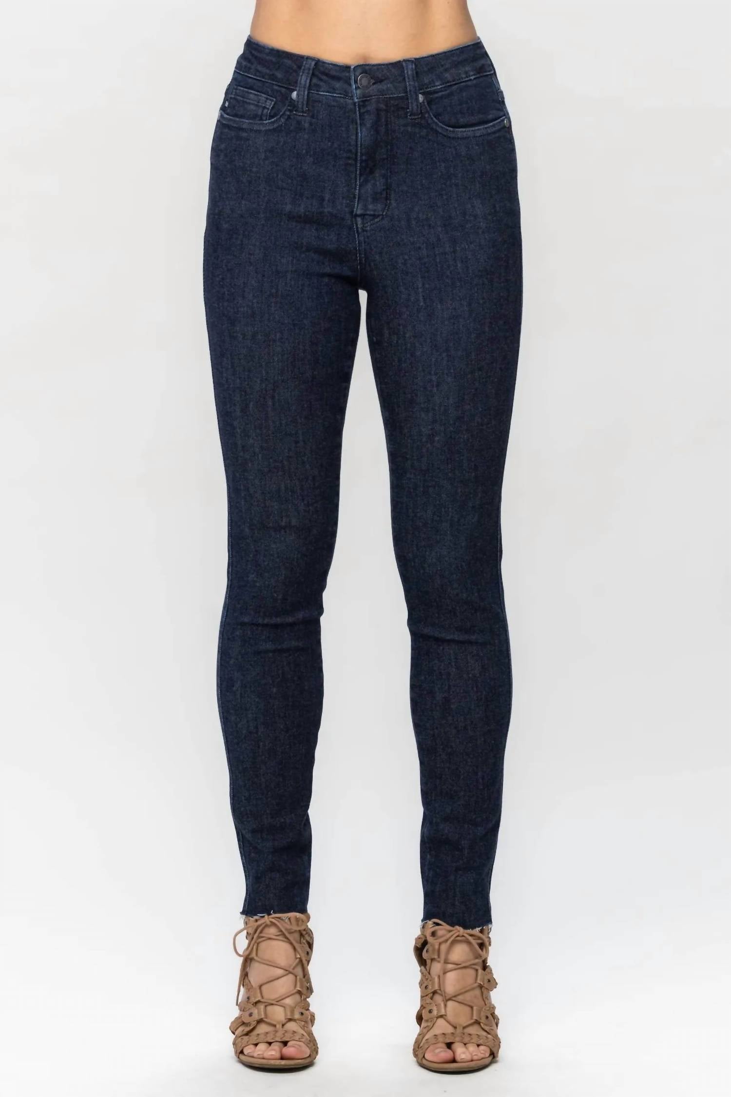 A calça jeans skinny perfeita para usar com suas botas favoritas nesta estação! Apresentamos a Calça Jeans Skinny Tummy Control Raw Hem da Judy Blue, o epítome do estilo elegante e confortável em jeans feminino. Esta calça jeans apresenta cintura alta com cós com controle de barriga e lavagem super escura para um visual elegante. Composta por uma mistura de algodão elástico (91% algodão, 7% poliéster, 2% elastano), ela promete um corte skinny com medidas de 27 cm de altura e 73 cm de costura interna. O fecho de botão, a bainha crua e o caimento clássico completam uma calça jeans que mantém o formato e oferece conforto excepcional.