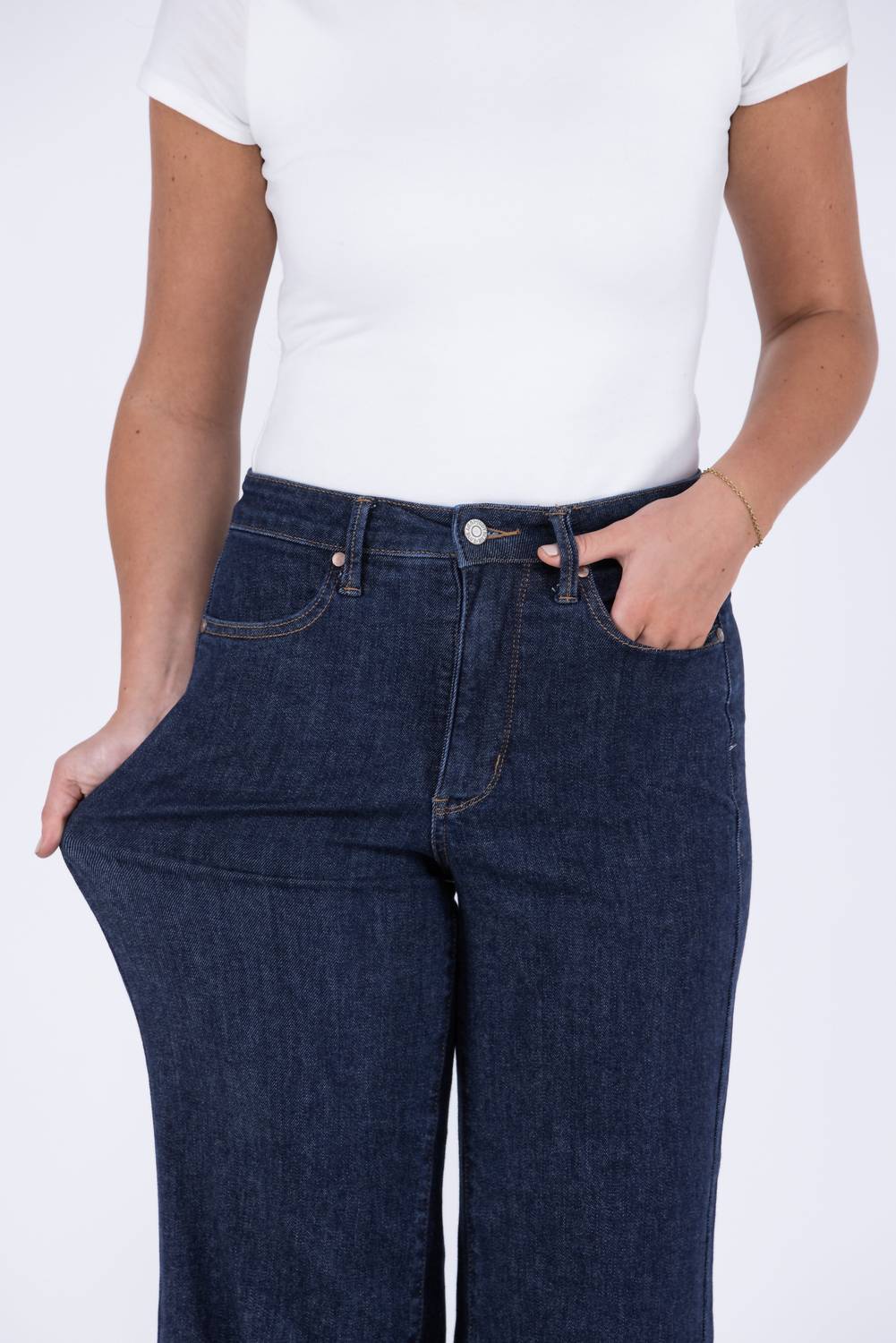Esta calça jeans apresenta uma mistura composta de 91% algodão, 7% poliéster e 2% elastano, confeccionada para um caimento relaxado nos quadris e coxas, com uma costura interna curta de 60 cm que valoriza o corpo. O design de cintura alta, medindo 26 cm, oferece controle superior da barriga para uma silhueta suave. Com bolsos traseiros abotoados com abas falsas e fecho de zíper, esta calça jeans sem desgastes proporciona um visual elegante, adequado para qualquer ocasião.