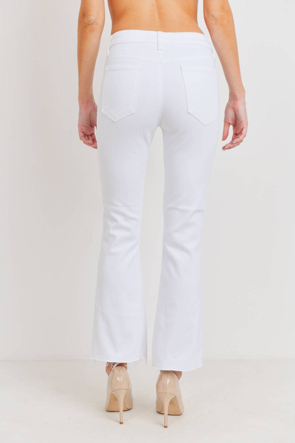 Just as cute as they are comfortable. Elevate your summer wardrobe with the High Rise Crop Flare Jeans in Optic White by JUST BLACK DENIM, perfect for vacation days with a minimalist flair. Crafted from a comfortable cotton blend, these jeans feature a stretch denim material in a flattering high-rise and slim fit design. The optic white solid pattern and flared leg style ensure a chic, stylish look, with measurements including a 10" rise, 28" inseam, and 9" leg opening. For easy maintenance, machine wash and lay flat to dry. Closure: Button closure. Pockets: Yes.