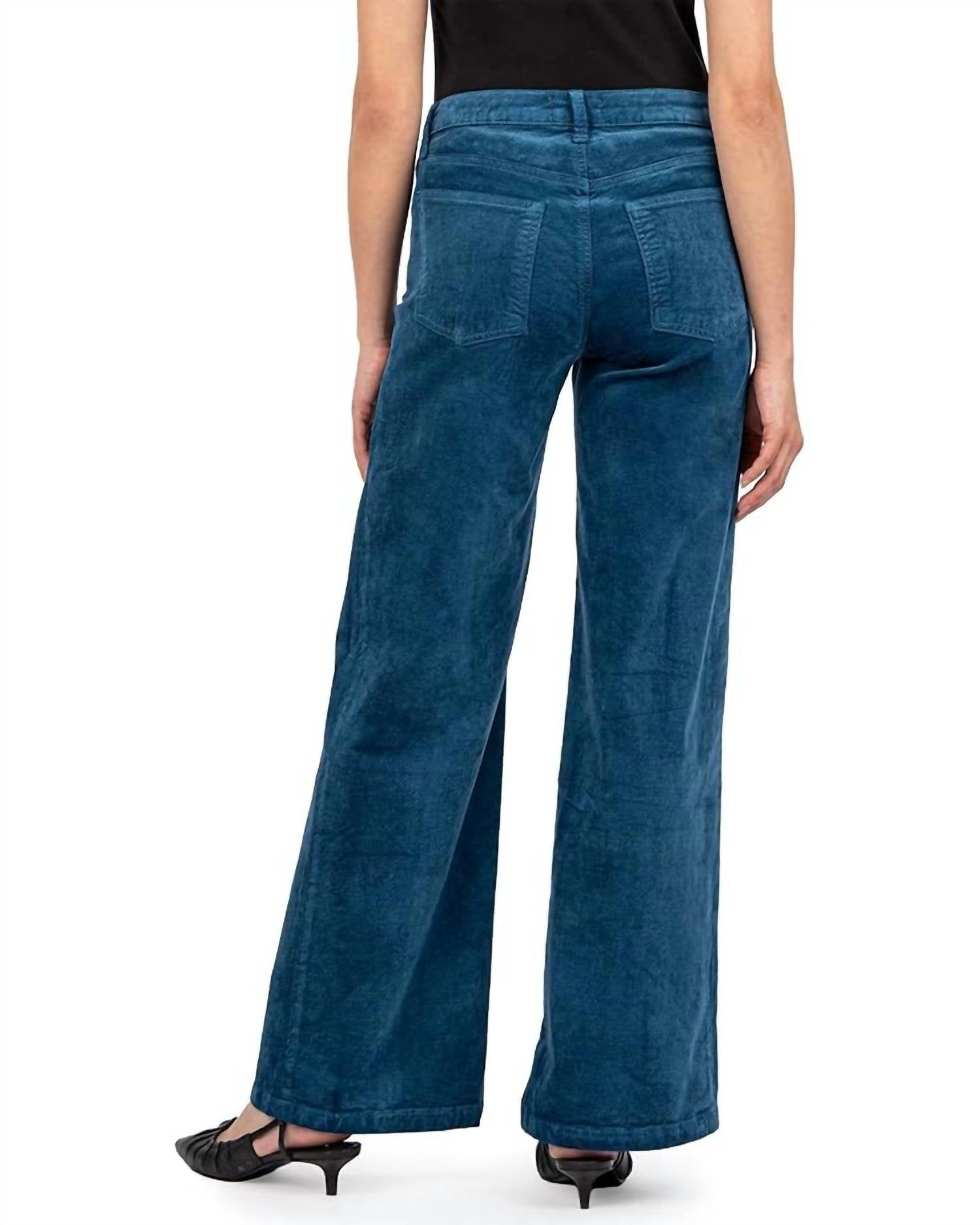Esta calça de cintura alta e lavagem média possui fecho de zíper e botão, passantes para cinto, design de cinco bolsos e estilo de perna larga. 55% algodão, 43% rayon, 2% elastano