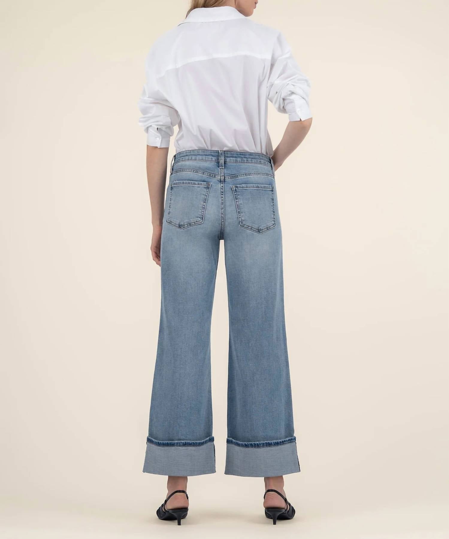 Descubra a calça jeans Meg High Rise Fab Ab Wide Leg da KUT FROM THE KLOTH, que combina perfeitamente o estilo vintage com o conforto moderno. Confeccionada em 98% algodão e 2% elastano, esta calça jeans oferece um caimento de cintura alta, completo com bolsos frontais com acabamento em fab ab. Com costuras internas de 69 cm após enrolado e 78 cm antes, esta calça jeans de perna larga também apresenta uma abertura de 58 cm. O fechamento é garantido por botão e os cuidados são tão simples quanto secar na horizontal.