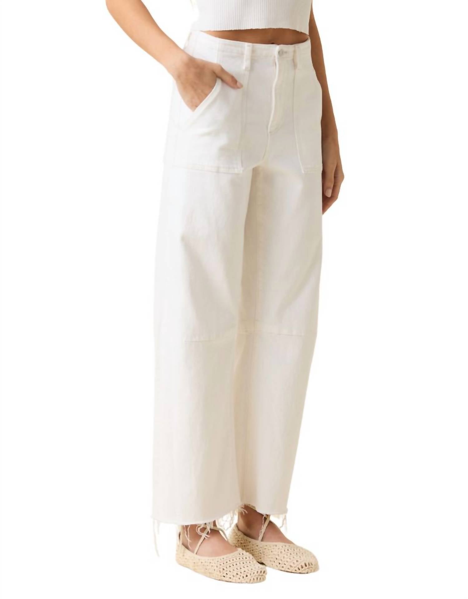 Você nunca pode ter shorts jeans demais e estes serão seus novos favoritos. Adote o estilo minimalista das férias com a Calça Jeans Utility Soft Barrel da Le Jean, confeccionada em uma mistura de algodão supermacio e de gramatura média para o máximo conforto. Esta calça jeans branca lisa possui fecho de botão e zíper invisível, proporcionando uma silhueta elegante com um cós lisonjeiro de 25 cm e uma costura interna de 66 cm. A composição do tecido é 98% algodão e 2% elastano, garantindo um equilíbrio perfeito entre estrutura e elasticidade. As instruções de cuidado recomendam lavagem à máquina em água fria para manter a aparência impecável.