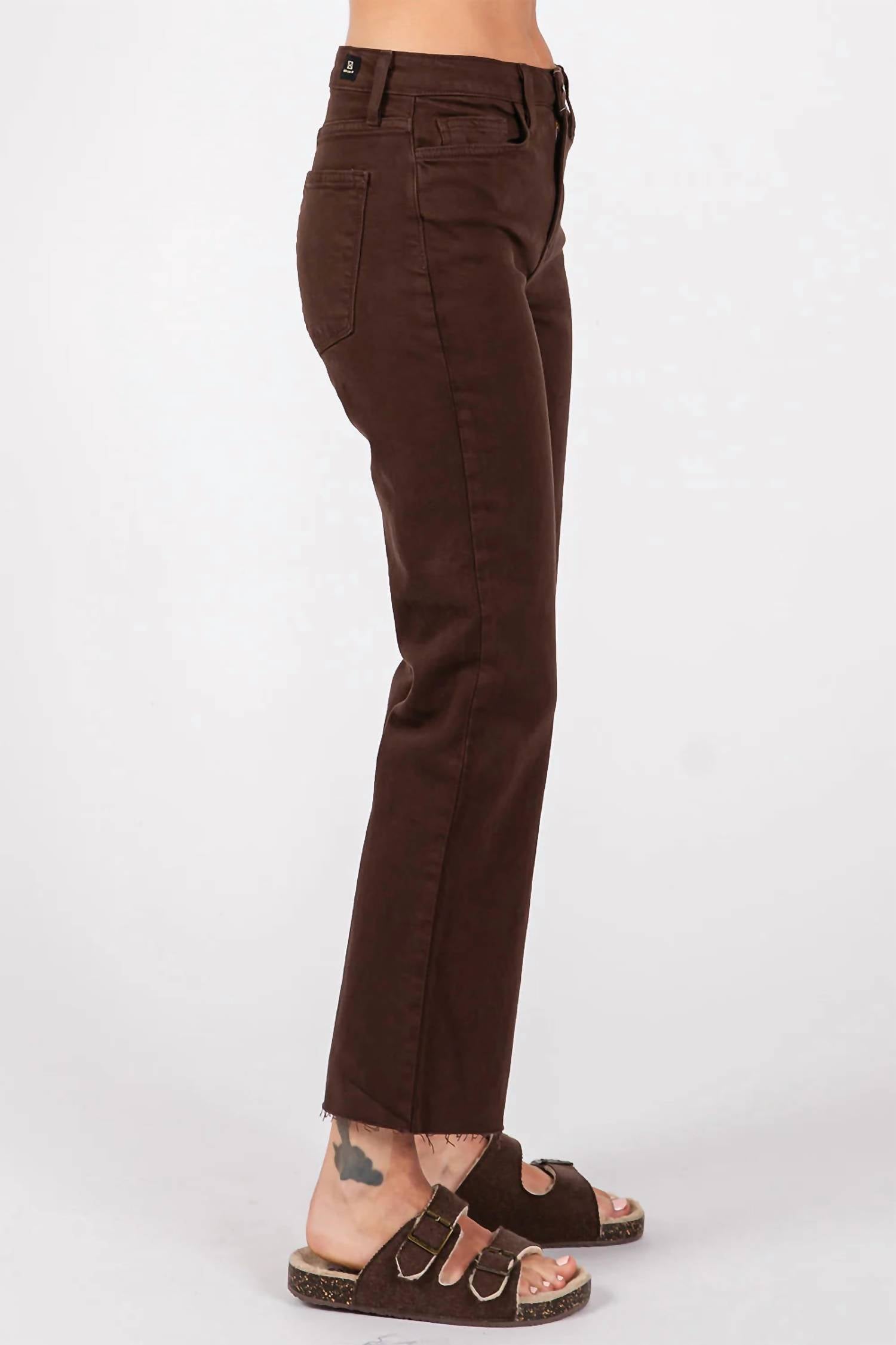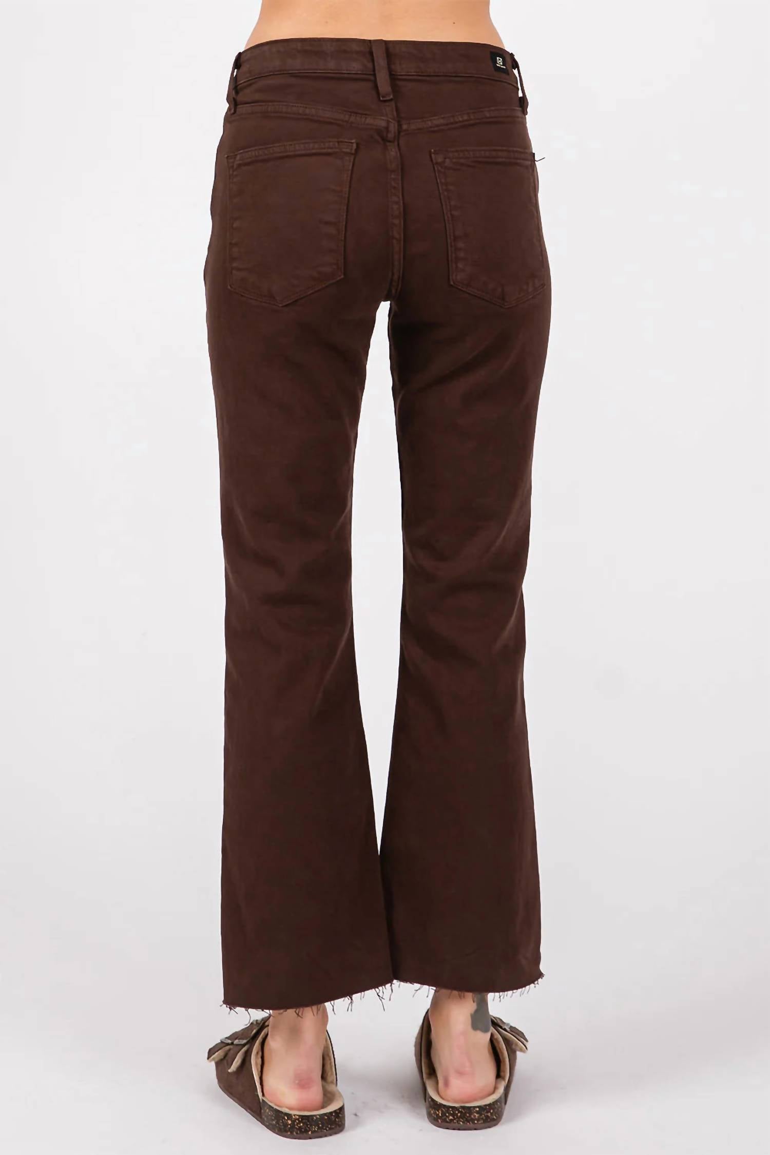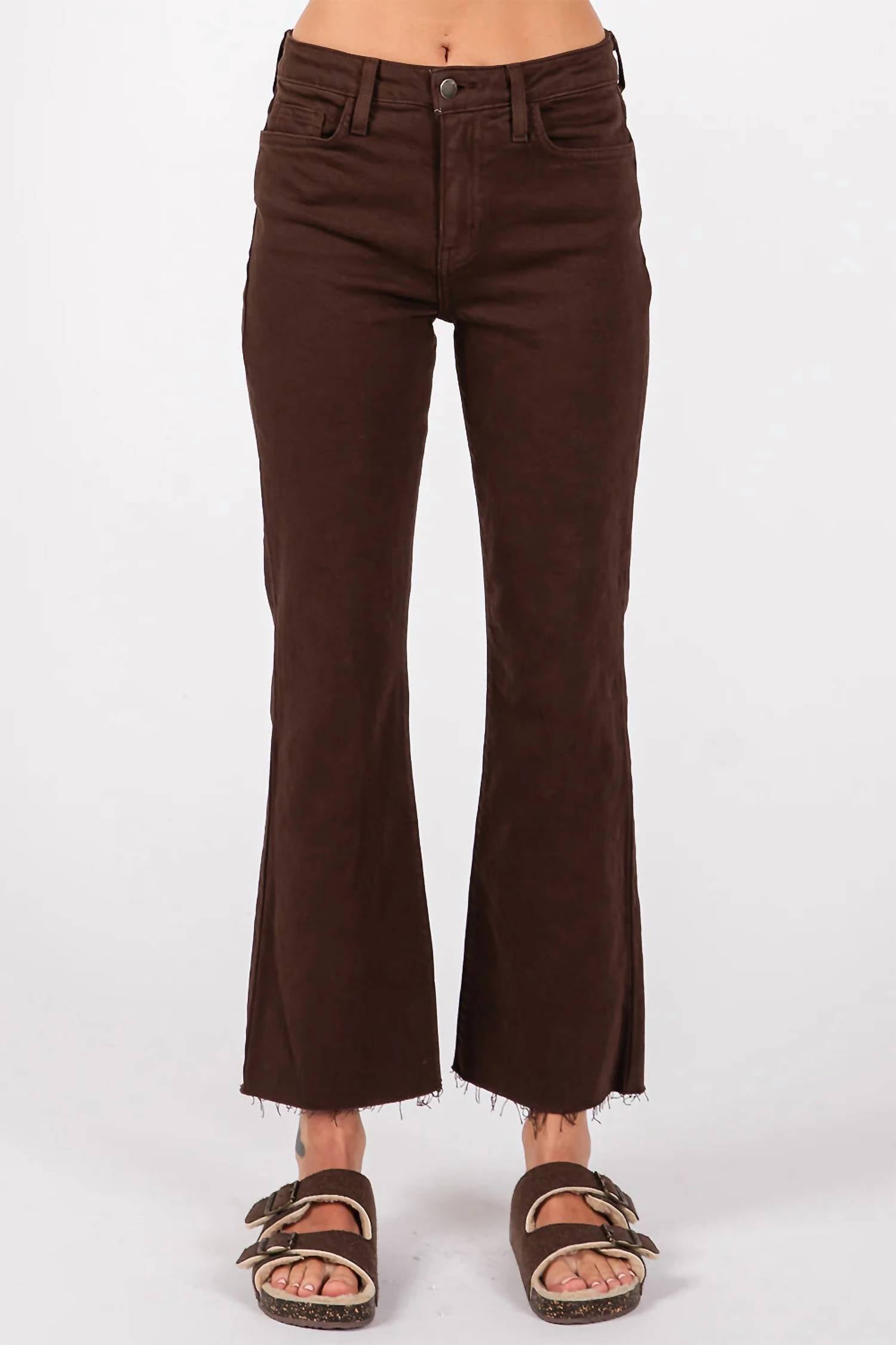 A flattering silhouette that's suprisingly versatile. The Chocolate Bambino Scissor Hem Crop Baby Flare Jean by Letter to Juliet is a chic addition to any wardrobe. Featuring a playful scissor-cut hem, these jeans boast a mid-rise and a stylish flared leg with a comfortable regular fit. With a composition of 99% Cotton and 1% Lycra, they provide both breathability and slight stretch, ideal for holiday parties or spring outings. Closure is secured with a button, while care is easy with machine wash and tumble dry instructions. Dimensions: Rise: 10", Inseam: 27", Leg Opening: 16".