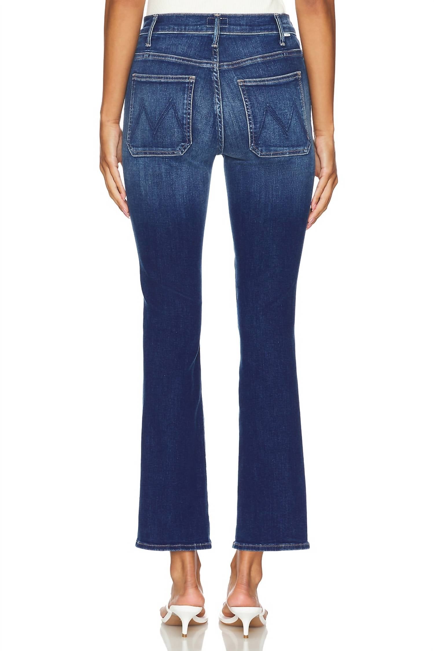 Discover the Skinny Patch Pocket Insider Flood Jeans by Mother, the epitome of 90s fashion with a high-rise waist and slim fit. Crafted in the USA from a comfortable cotton blend, these jeans feature a medium wash with whiskering and fading at the knees. Designed with a 28.25-inch inseam, they have a skinny leg that measures 12 inches at the knee, breaking down to a 14-inch opening. Closure: Zip fly with button closure. Care: Machine wash and tumble dry.