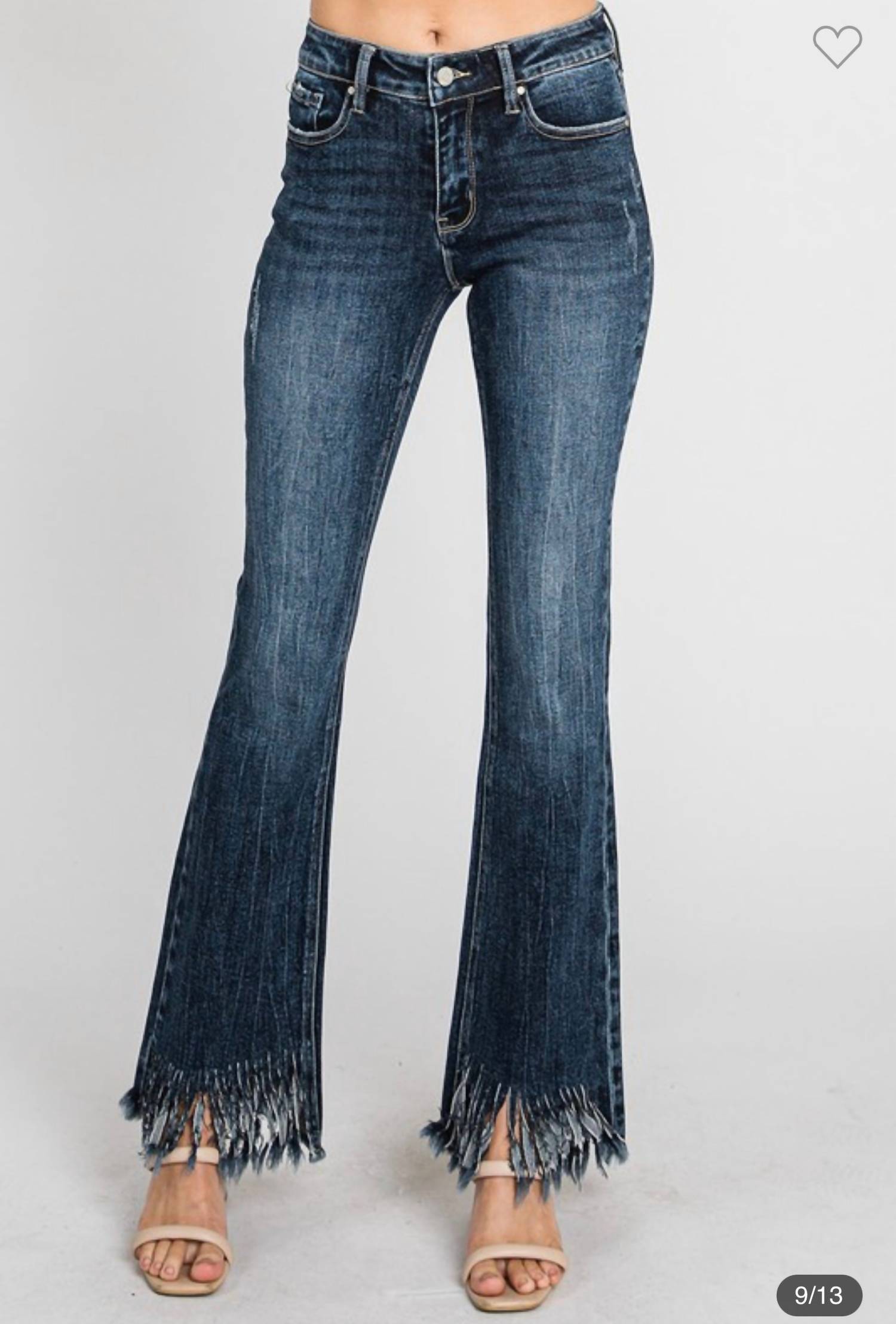 Petra153 - Calça Jeans Bootcut Clássica de Cintura Média com Franjas na Barra