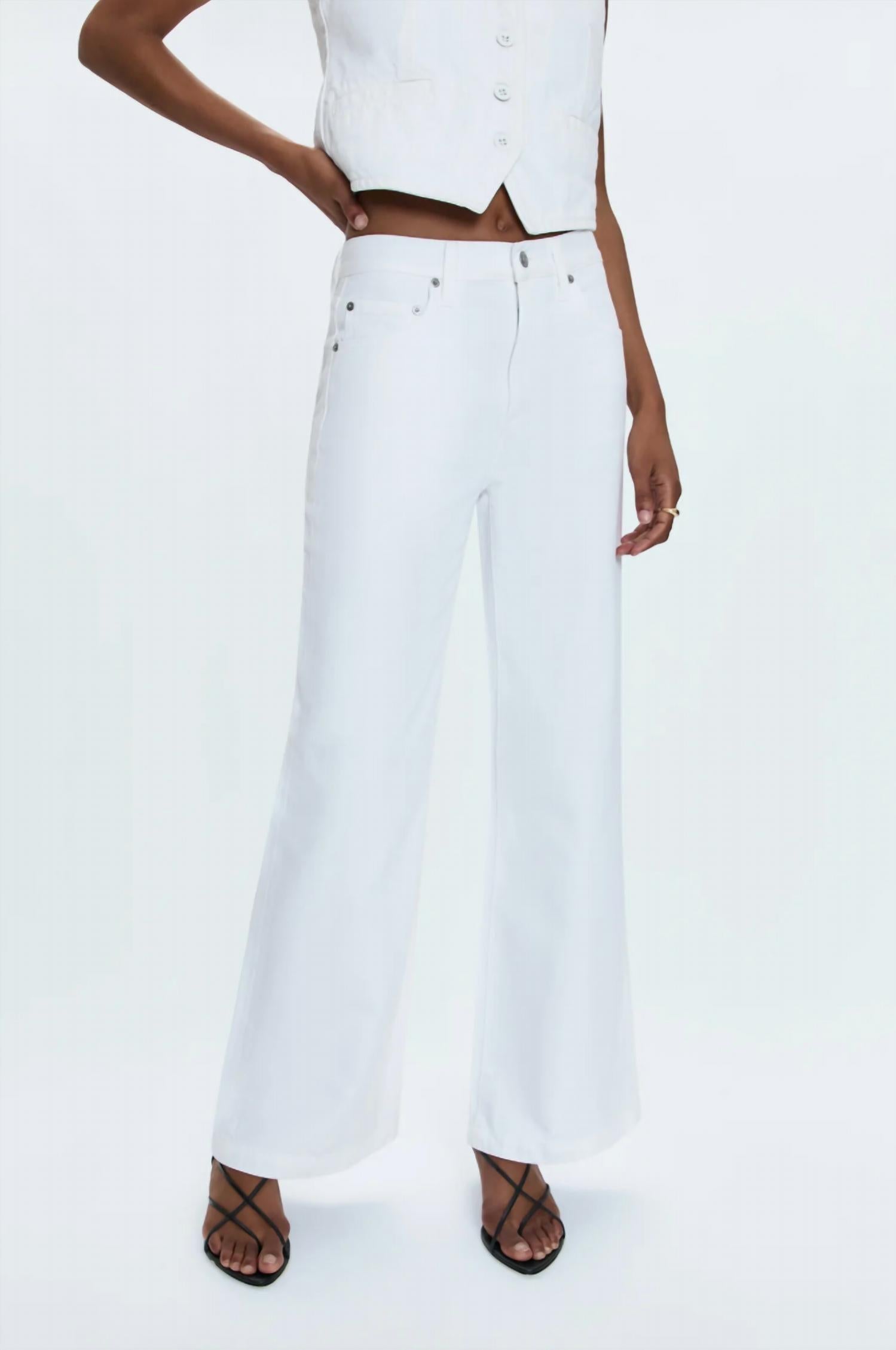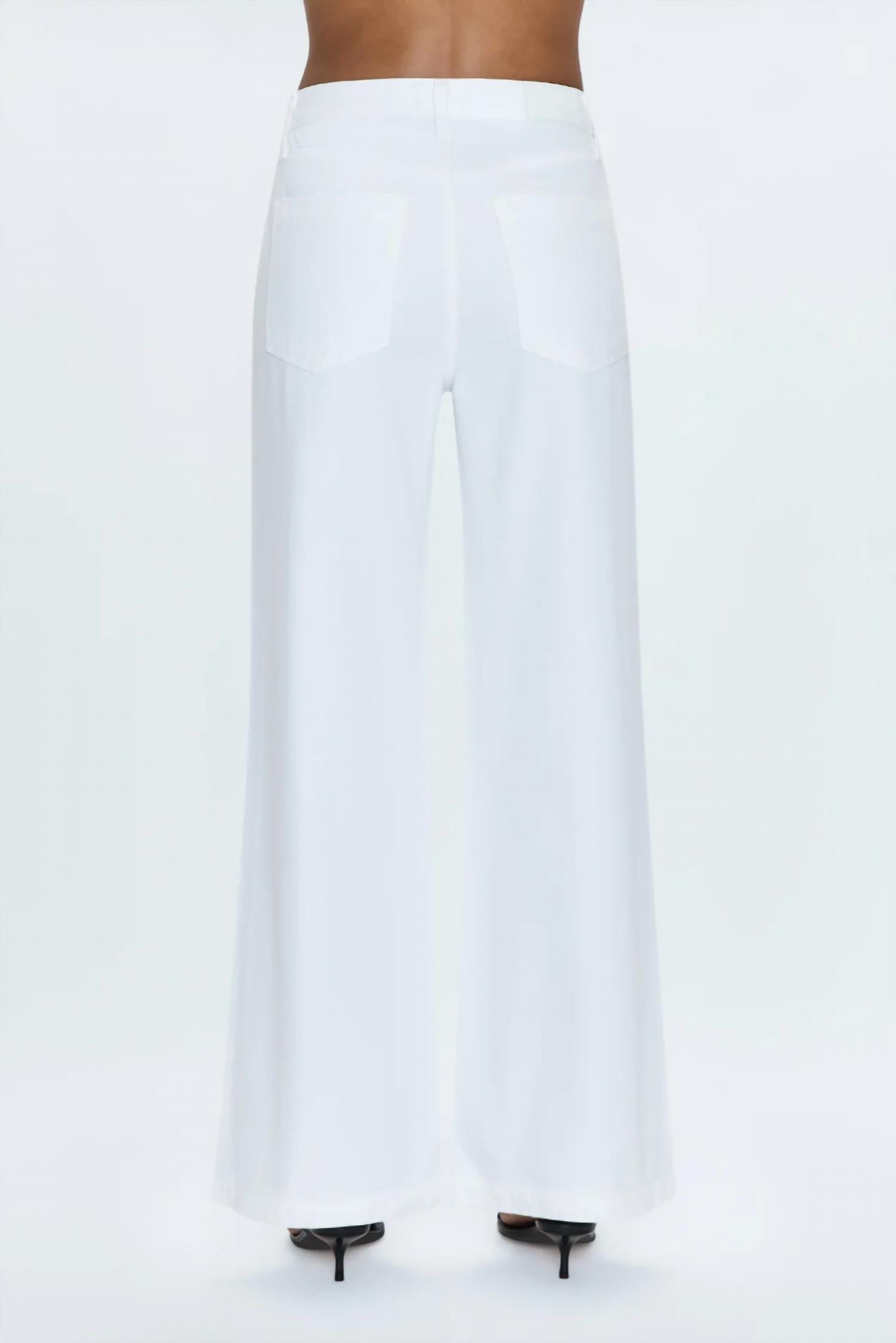 A calça jeans Palazzo Jaydn Low Slung da Pistola oferece a estética cool girl por excelência, com caimento relaxado e pernas largas. Confeccionada em uma combinação respirável de 62% algodão e 38% liocel, esta calça jeans branca vibrante apresenta 29 cm de altura e 81 cm de comprimento. A estampa sólida e o fecho de botão contribuem para sua simplicidade elegante, tornando-a a escolha perfeita para ocasiões em climas quentes. Com bolsos práticos e uma referência moderna à moda dos anos 90, esta calça jeans é ideal para um look de férias de primavera. A modelo tem 1,75 m e veste tamanho 26.