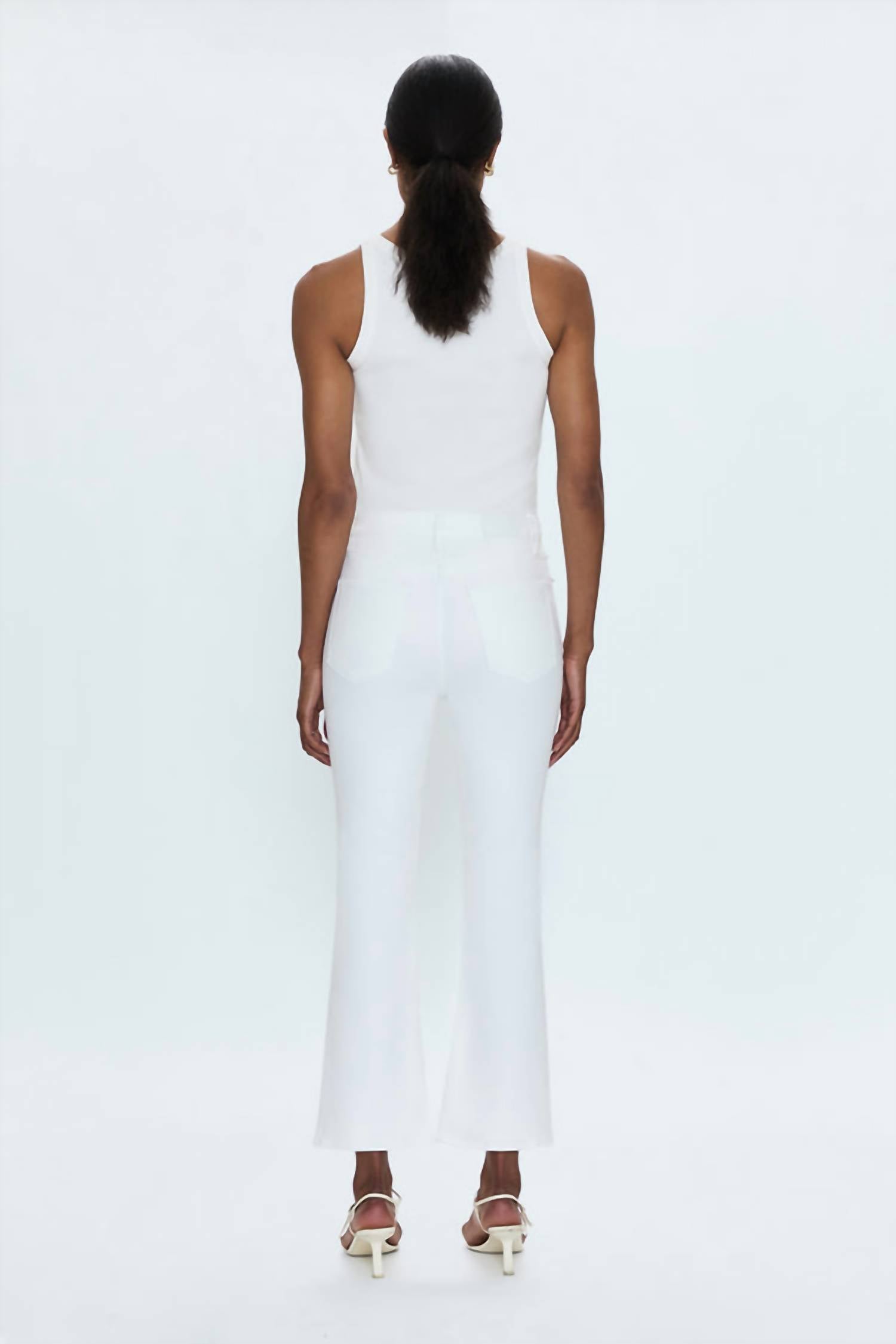 Apresentamos a Calça Jeans Lennon High Rise Crop Boot da PISTOLA, uma peça chique disponível na cor Branco Vivo. Esta calça jeans feminina apresenta cintura alta, perna curta estilo bootcut e bainha desfiada, tudo confeccionado em um padrão sólido. Composta por uma mistura de algodão com 67% algodão, 9% rayon, 22% poliéster reciclado e 2% elastano, esta calça promete conforto e estilo. Fechamento: Fechamento por botão. Cuidados: Lavar à máquina e secar em tambor. As especificações de ajuste incluem um cós de 28 cm, uma costura interna de 68 cm e uma abertura de 42 cm.