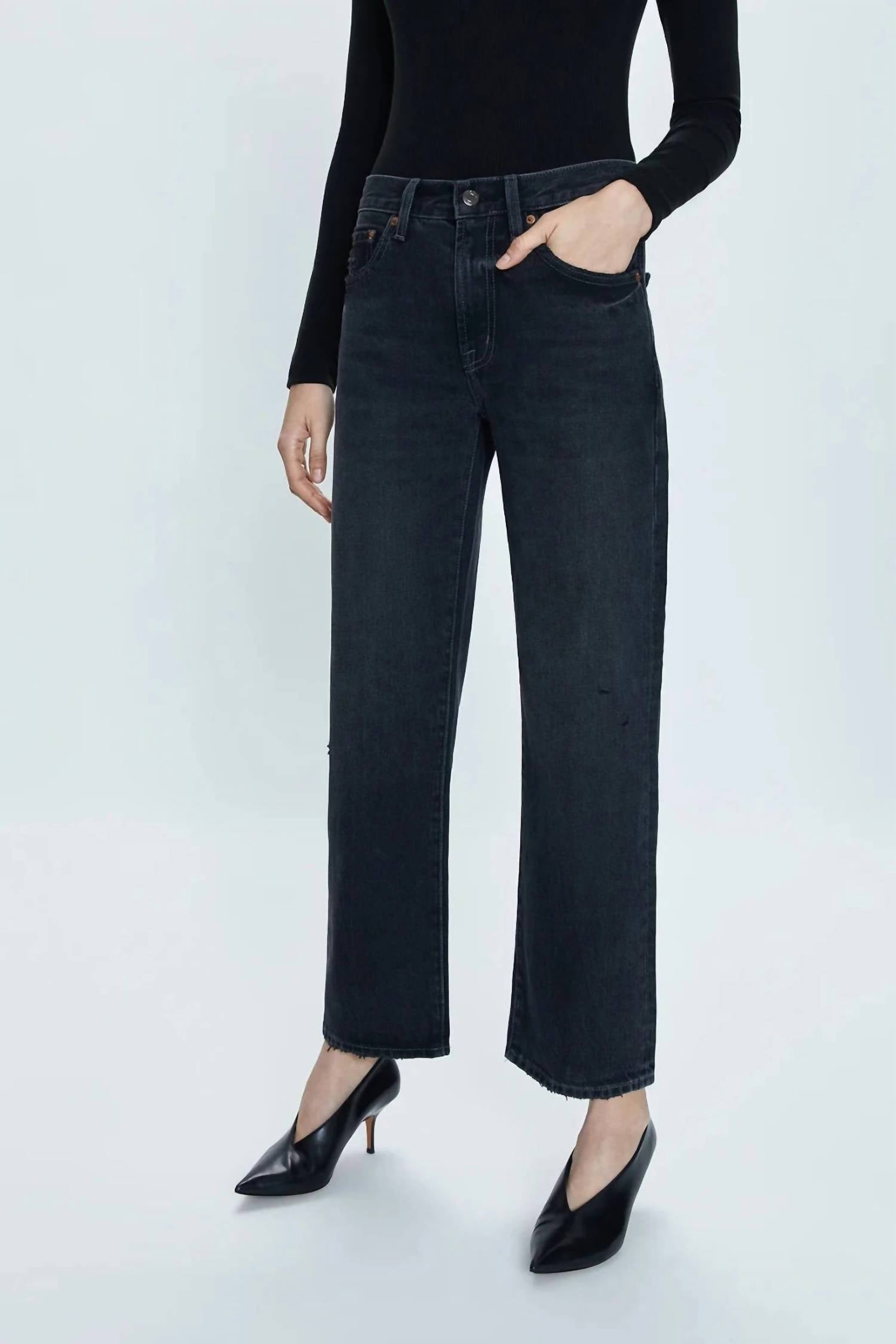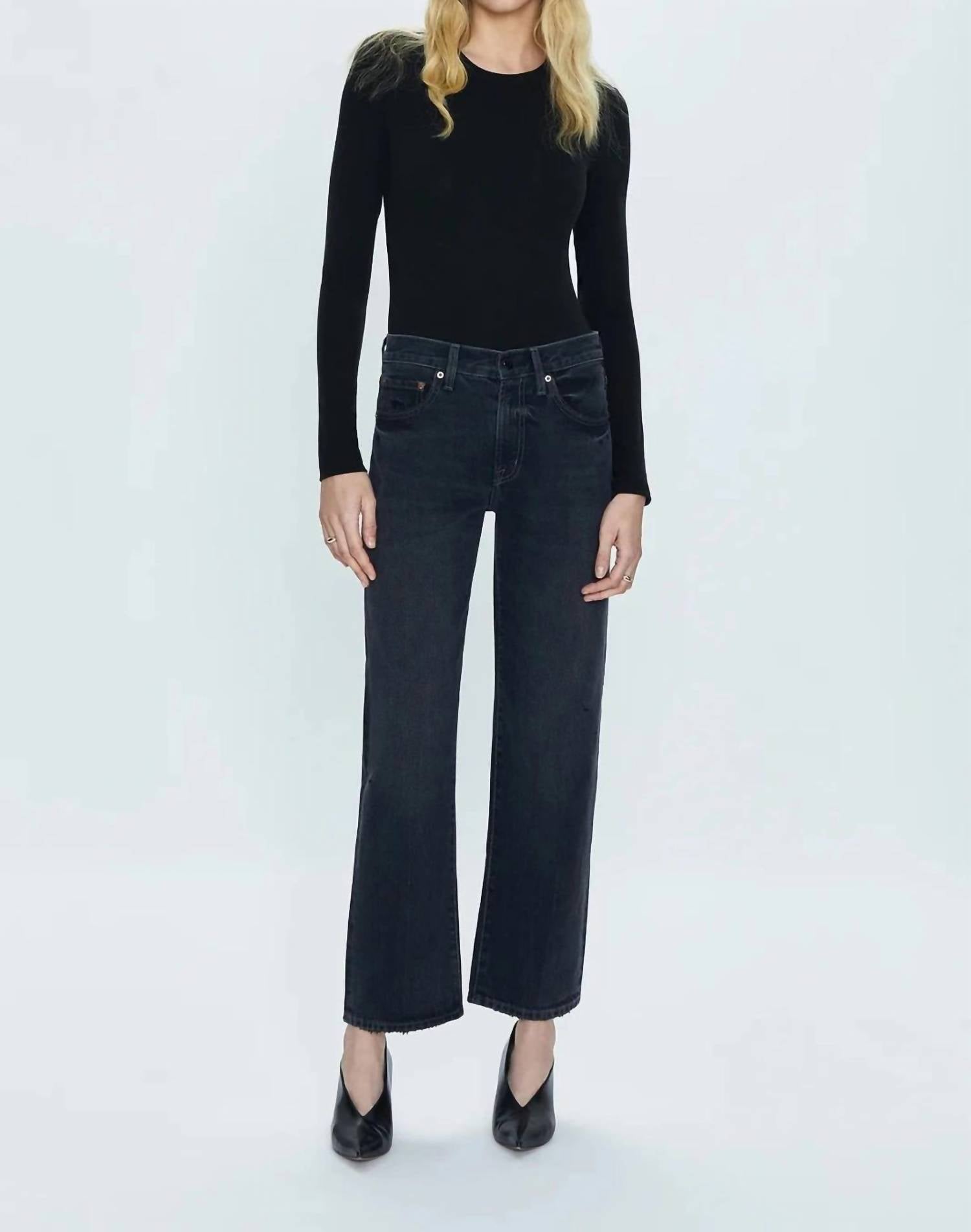 Combine esta calça jeans reta com sapatilhas, sandálias ou até mesmo saltos! Não tem como errar. Experimente uma mistura de moderno e clássico com a Calça Jeans Reta com Cós Curvado Lexi Mid Rise da PISTOLA, com uma distinta influência planetária preta. Esta calça jeans é confeccionada em 100% algodão rígido e não elástico e possui 25 cm de altura e 73 cm de costura interna, proporcionando um comprimento curto até o tornozelo. Desenhada com uma perna reta que se arqueia em um formato de barril, a bainha clean e os detalhes contrastantes realçam sua aparência elegante. Fechamento: Botão.