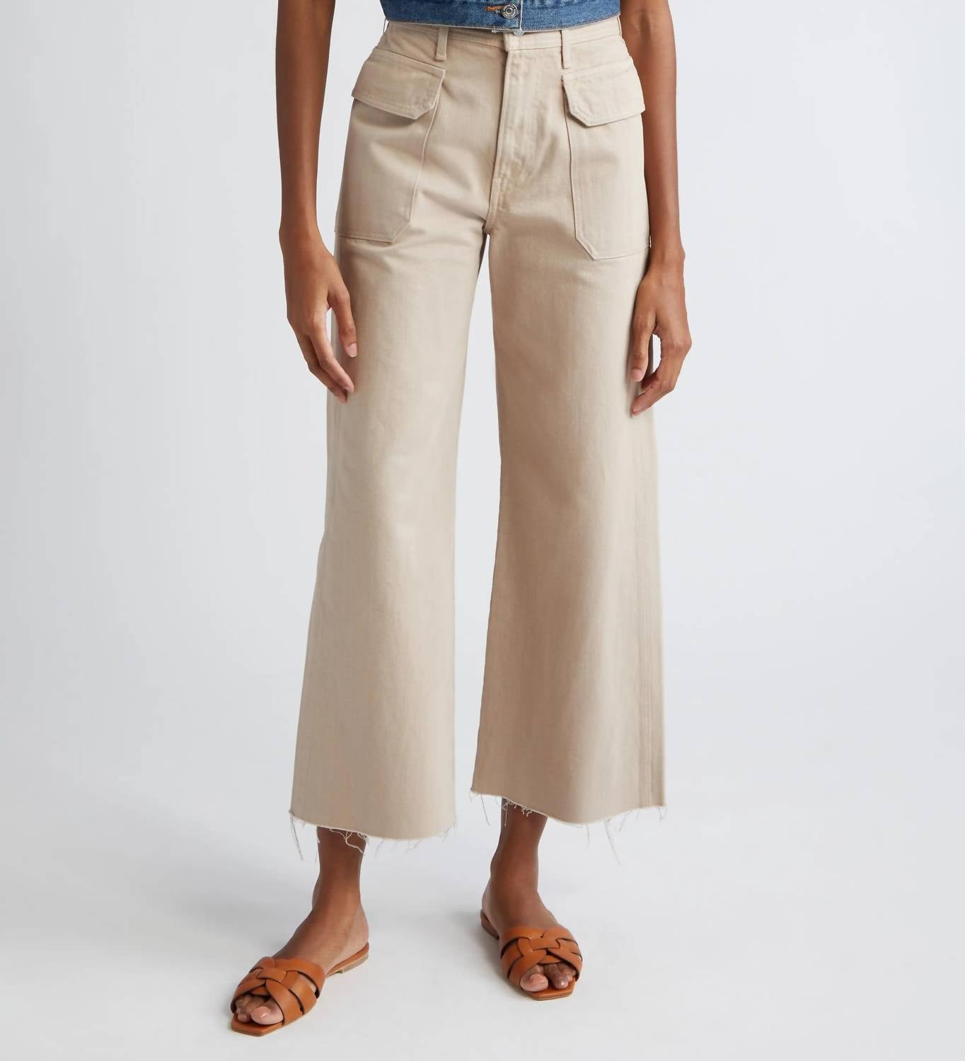 Apresentamos a Calça Jeans Cargo Taylor Crop Wide Leg da Veronica Beard, uma peça marcante em cáqui versátil. Esta calça jeans de cintura alta apresenta um caimento relaxado com um estilo de perna larga, acentuado por bolsos cargo modernos. Confeccionada em 100% algodão de qualidade, possui 30 cm de altura e 68 cm de costura interna, proporcionando uma silhueta elegante. Fechamento: Botão. Cuidados: Lavar à máquina com água fria, do avesso. Fabricada nos EUA com materiais importados.
