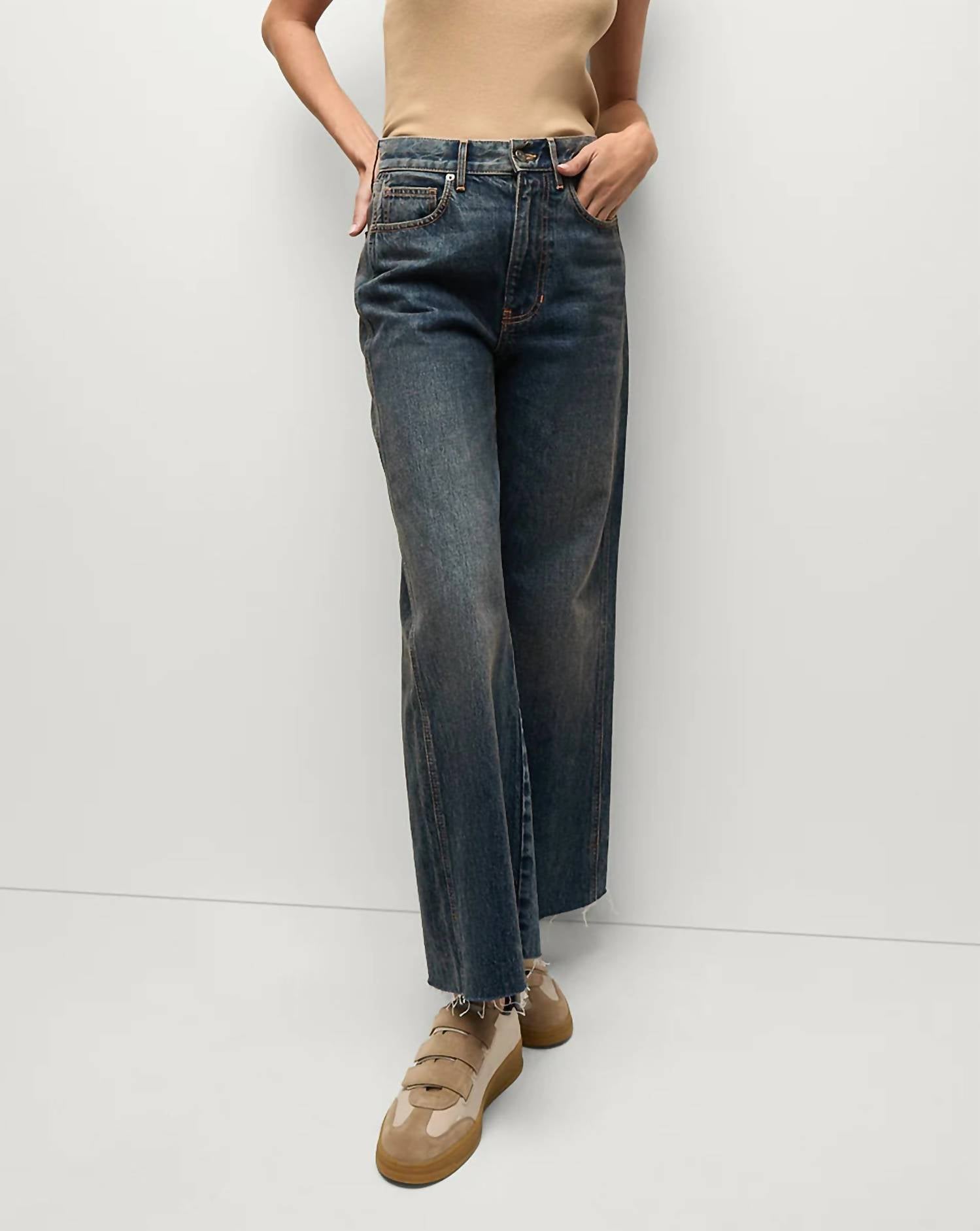 Conheça a calça jeans Taylor Cropped Wide-leg da Veronica Beard, uma adição chique a qualquer guarda-roupa em azul-escuro atemporal. Confeccionada em 100% denim italiano premium, esta calça apresenta cintura alta e perna larga, com um caimento relaxado, perfeito tanto para sapatilhas quanto para saltos. Com fecho de botão e bolsos práticos, ela incorpora estilo e funcionalidade. Fabricada nos EUA, cuide dela virando-a do avesso, lavando-a na máquina com água fria e pendurando para secar.